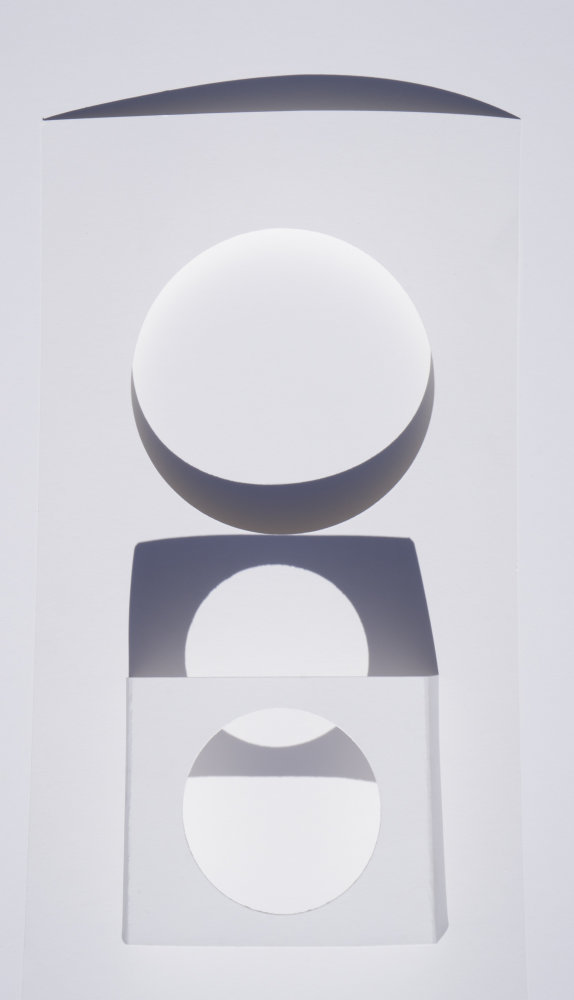 Biondo plays with these shadows rolling across different surfaces. As light is obstructed, the darkness of shadow is created. She tricks our vision and redirects our perception. The artist is teaching us how to gain pleasure in the simple manipulation of a surface. With a surface that is rounded, the shadows spreads. With a surface is flatter and firmer, the shadow sharpens. The A Legacy of Shadows works are much more about light against physical surfaces or snow following the undulations of ground and rock, rather than just light on paper as was done in Rayleigh Shadows. If one looks closely, we can see that Shadow Legacy no. 5 has shadows flowing over and across folds of paper acting as mounds on a flat surface. In Shadow Legacy no. 18, Biondo uses a circular shape as if looking through a telescope to see the shadows of leaves cast onto flat and rounded surfaces.