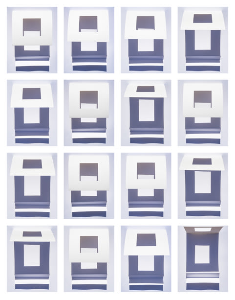 Rayleigh Shadows no. 6 and Grid Variations (Wind Effect) are beautiful examples of Biondo’s unique approach to image creation. She has carried forward her technique of photographing, printing, cutting and bending paper. With Rayleigh Shadows no. 6, white paper is cut, manipulated and positioned to create and capture shadows. The abstraction dominates what we see in a nod to the much earlier works of surrealists. Importantly, none of the image is artificially created in post-production work. As with prior Biondo images, each is a traditional photograph that is captured with one click of the shutter. Grid Variations (Wind Effect) is a grid comprised of 16 panels, each following the same individual technique of Rayleigh Shadows no. 6. With Grid Variations (Wind Effect), Biondo has created an installation that shows the passage of time by capturing images of the paper templates as they are batted about by a light wind during her shoot. Where each could stand on its own within the intent of her project, the repetitive patterns become a challenging installation for light and shadow, and bear evidence of a spontaneous collaboration with environmental conditions.