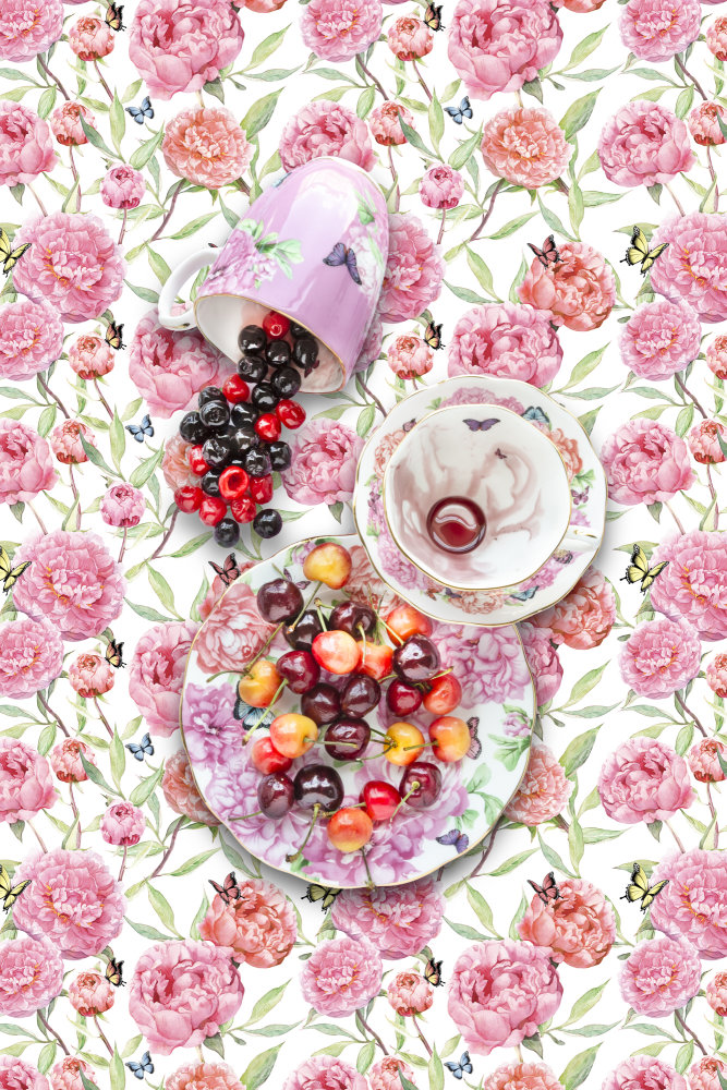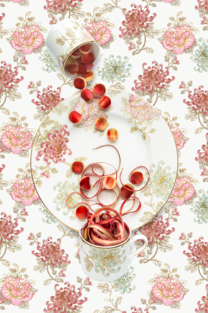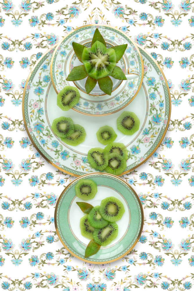 Terlizzi’s choice to create a body of work around fine china is fascinating not only in its photographic history but also because of the rich story behind the subject. What makes fine china special, and how did that motivate Terlizzi to photograph it? How did he come to the process of replicating the patterns on the dishes as backgrounds for the china itself? The original patterns may have been hand painted, depending on the producer. Terlizzi replicates the China pattern using technology to create a wallpapered back ground of the pattern in the plates. Then he adds his own touch. In selecting and artfully laying out a fruit or vegetable with the plate, and using technology to produce a wallpaper-like background echoing the pattern in the fine china, he is creating something new and unique.
