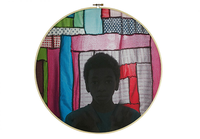 In a sense, Huckaby’s image “The Rising Sun” is literally capturing a moment in time, yet it is not about a moment in time. If an image is documentary, it records an event, as Roland Barthes might argue in his book “Camera Lucida.” This image, as with other work by Huckaby, seems to place this young boy is a space moving through time. Why is that? It is the use of light. Because the image is backlit, and the face of the boy recedes into shadow, the image is not literally a portrait of a person. We use portraits to record a loved one and hold the image dearly through time to recall that age, time, and place. Instead, this image could be more of a place holder for either all young people of that age, or more specifically all young men of that age. If the image is freezing our attention on a young African American boy, and Huckaby’s intent is about the future and not the present, then we can read this image very differently. The image then becomes all about what our expectations are for this youngster. Huckaby is capturing, through printing on cotton, this person’s past heritage. The embroidery hoop may function as a symbol of how heirlooms are created and of tradition, connection to family and heritage passed from generation to generation. If so, the bright colorful background gives a sense of joyousness. The viewer may feel elation and hold a message that is positive and full of hope that this son is rising into a new and different future.