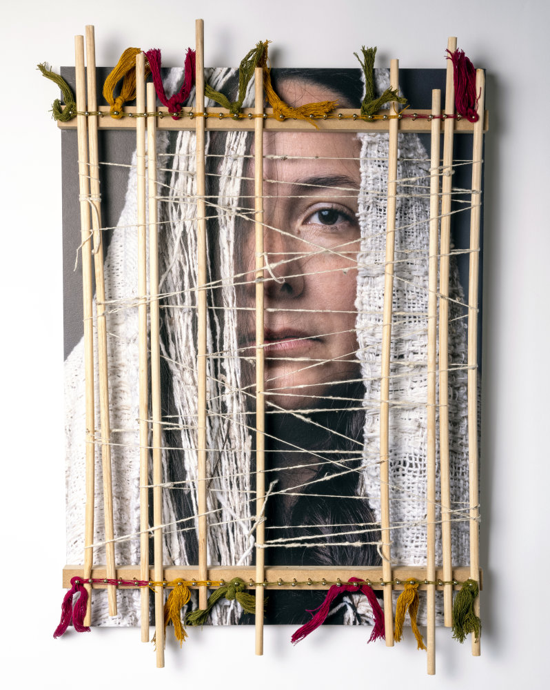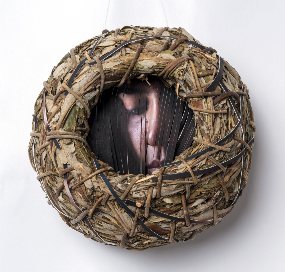 With Peralta, however, the works created are physically 3-dimensional sculptures that become the objects of art to embrace.  Peralta’s most tactile pieces, as again observed by Cheung,  such as the basket  (“Disassemble 54”, below), by use of craft materials, turn her photographs—which are pristine portraits on their own—into something more accessible, in the sense that they are not presented as standard print on paper on the wall.  In “Disassemble 54”, Peralta inserted a portrait she created into the basket, or nest as it might appear, which was constructed by Craftswoman Eva Salazar, a member of the Kumiai Community of Baja California Norte, according to Peralta.  “The basket is made with willow leaves and branches.  It is used to collect and store seeds and fruit.”  Cheung’s reaction was that:  “The work is so wonderfully tactile that it looks like it’s meant to be handled/touched (even though it’s not!).”