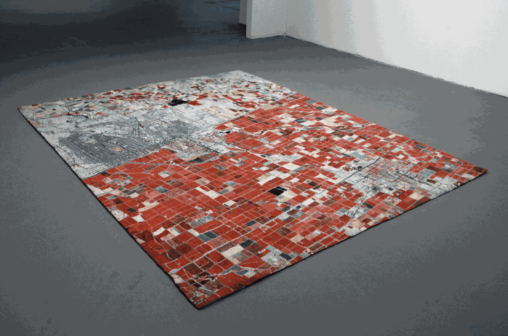The satellite images contrast the US-Mexico border. Depicted are a city of 100,000, on the US-Mexico border, Mexicali/Calexico, through which thousands of people cross back and forth between countries each day. The rug image contrasts the agricultural richness on the US side with the much more barren Mexican side. It engages the viewer to think about what they are looking at, and why different zones on the rug are one color or another, and to ask – why this area? What is special, important or happening in this location that Noelle Mason look the time and energy to seek out publicly available information and present it to us in this format?