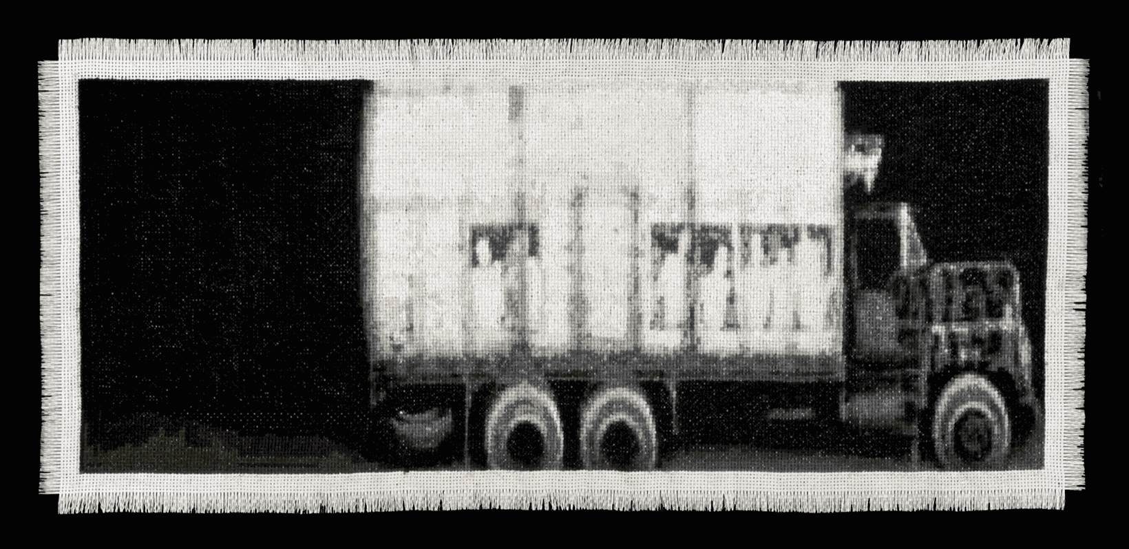 Mason’s cyanotype images invite the viewer into an unreal twilight-type zone we don’t want to believe exists. She refers to these as a “Backscatter Blueprint”. The images are obtained from a backscatter x-ray machine, a new form of digital imaging. The technology is similar to the full-body scans used at airports for passenger screening. Each blue-toned image is a skeleton-like outline of a truck in which we clearly see chalk-toned ghost like bodies hidden away. The figures are unnatural looking, not of this world, even though each figure represents a living, breathing person. The figures are standing, bending, sitting and lying. They are in tightly packed groups or alone in different sections of a truck. Some of the trucks are long, some smaller, but all arranged to hide the human cargo.