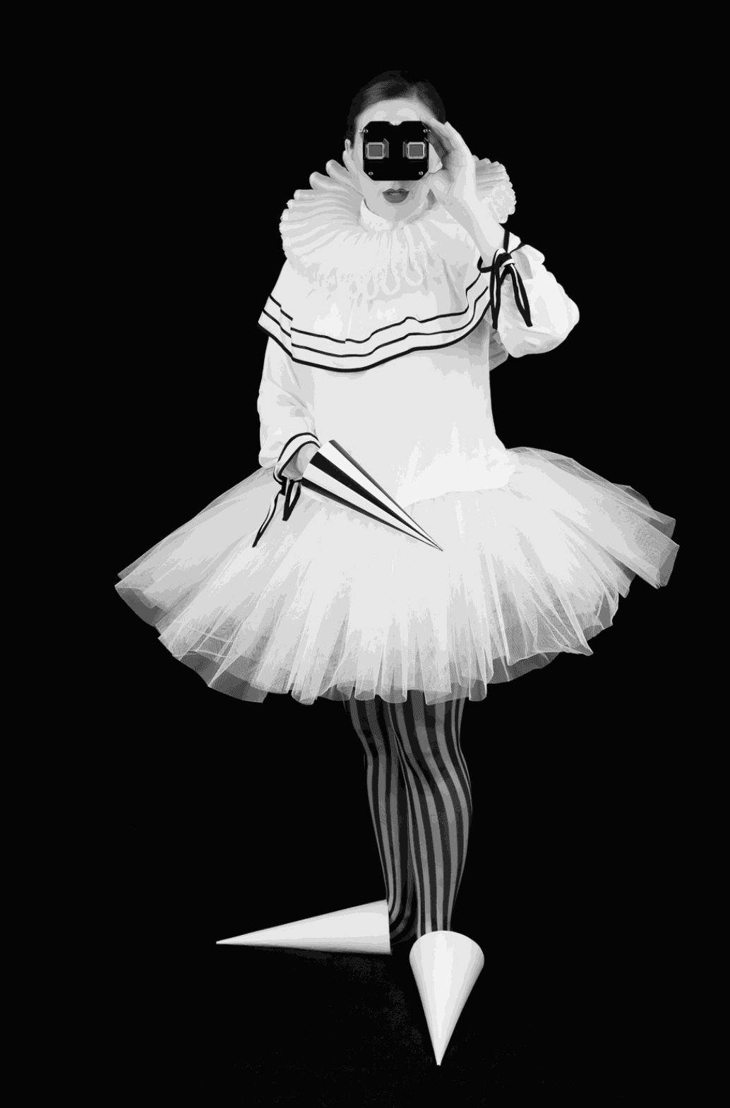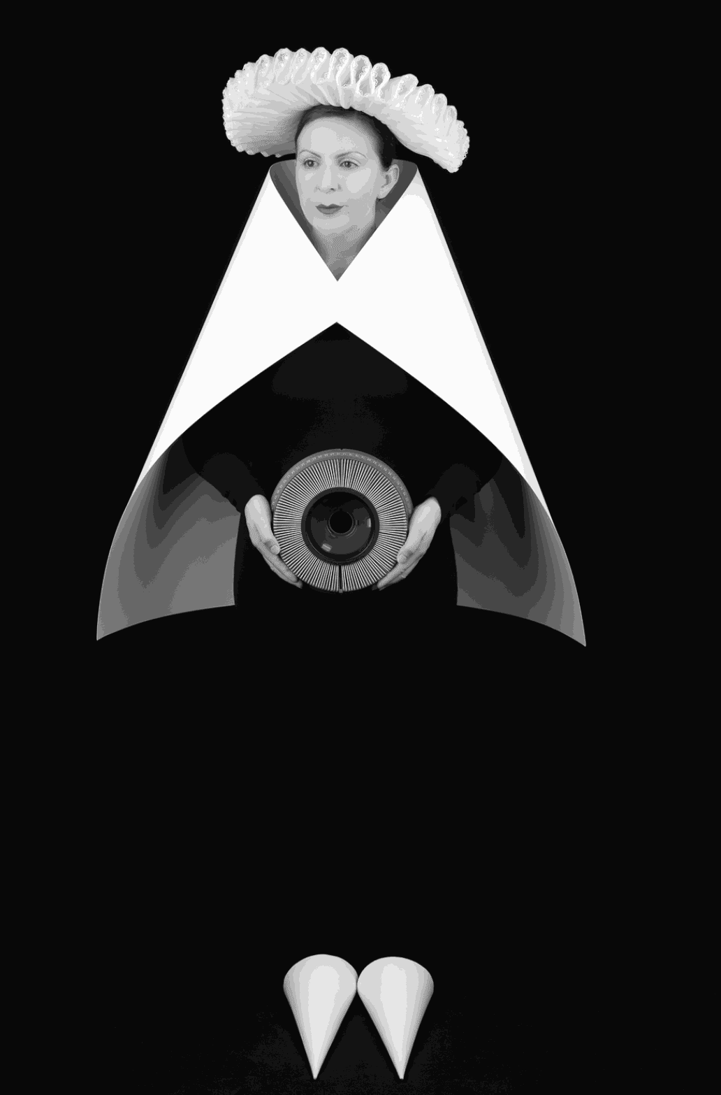 Brandy Trigueros’ “The DadaByte Theater” is a wonderful and imaginative performance art series about our selves, our bodies and entanglement with technology in today’s world. Her series is rooted in how we tether ourselves to phones, computers, television and radio in an almost constant barrage of information, entertainment and distraction. Trigueros commented: “When I began The Dadabyte Theater, I was subconsciously drawing upon artistic influences from the Dadaists and Bauhauslers of the 20th century who made work as a way to reflect on what they saw as a decaying of culture during their time. I too reflect on the decay brought upon technology in the 21st century as well as the hopefulness it can bring to this century and beyond.” Using her own body as the stage, she dresses herself in circles and cones, entangles herself in well formed wire on her head and neck, with technology from different periods like old tape cassettes, stereo view cameras, and many other materials. In her image “Virtual Reality”, she includes the stereo view device and reminds us: “In a computer simulated society technology becomes an appendage or extension of the body, in this case artificial retinas.” In essence, Trigueros reminds us how we use technology as an escape mechanism into a different world than our own.