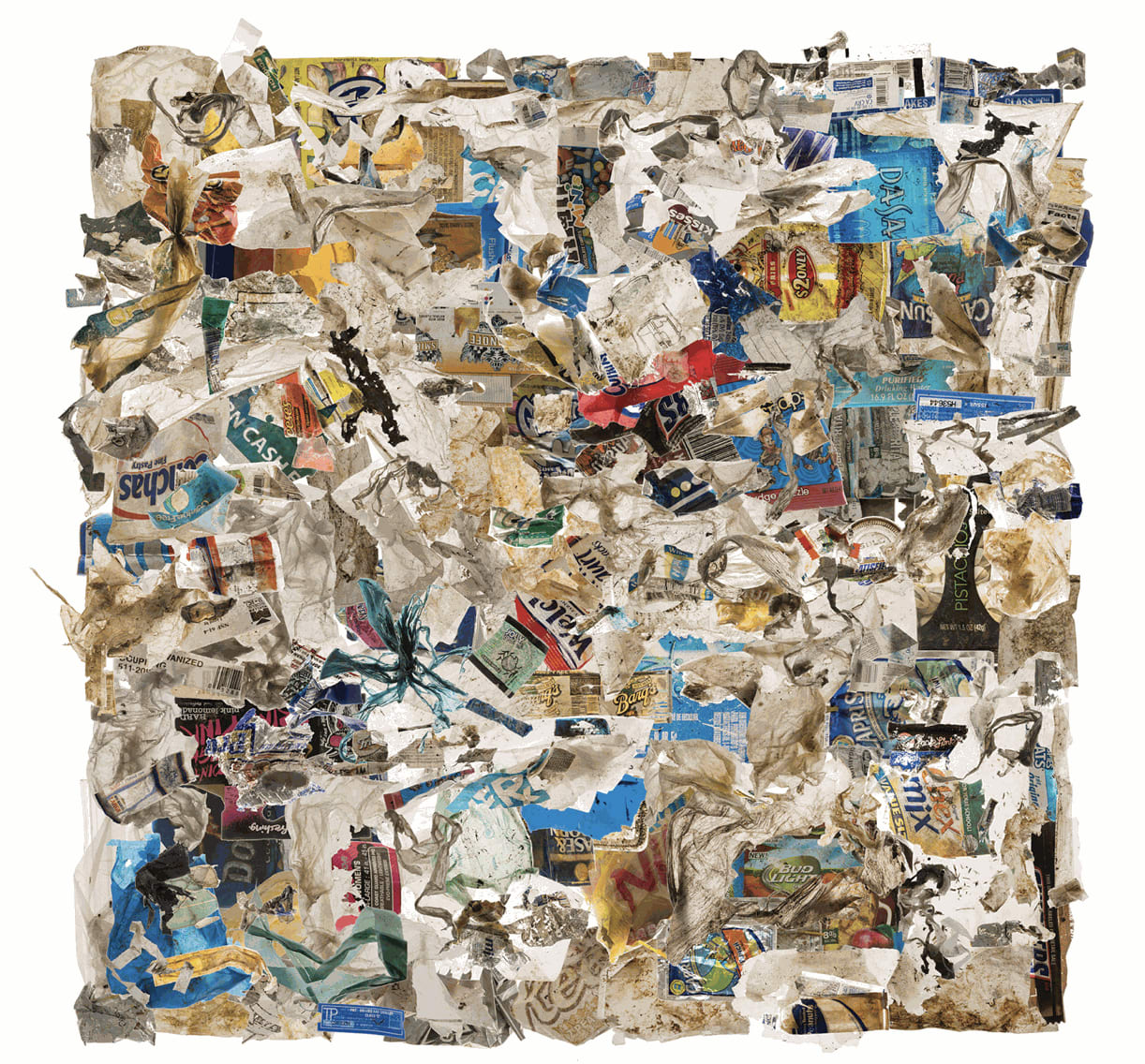 The image “A Bad Wrap” is a new direction in Wilkes’ work that carries a warning. Previously, her work in “From Janie to Janie” were laid out found objects, of a similar type, that presented a viewer evidence of discovery in an orderly, structured, rigid pattern. In “A Bad Wrap”, there is a visual sophistication. The viewer sees an interesting abstract artistic image, but, on closer inspection, find that the intriguing visual pattern is really an accumulation of garbage. Beauty is combined with disgust and the realization of what we are doing to our environment. Other artists have traversed this issue. We think of the photographic art of Alejandro Durán in his series “Washed Up: Transforming a Trashed Landscape”. Wilkes’ work presents a different country, a different place and a different means of discovery. That makes her work a reminder that the damage we inflict on our environment is not limited to one country, one image or to one artist’s voice of expression.
