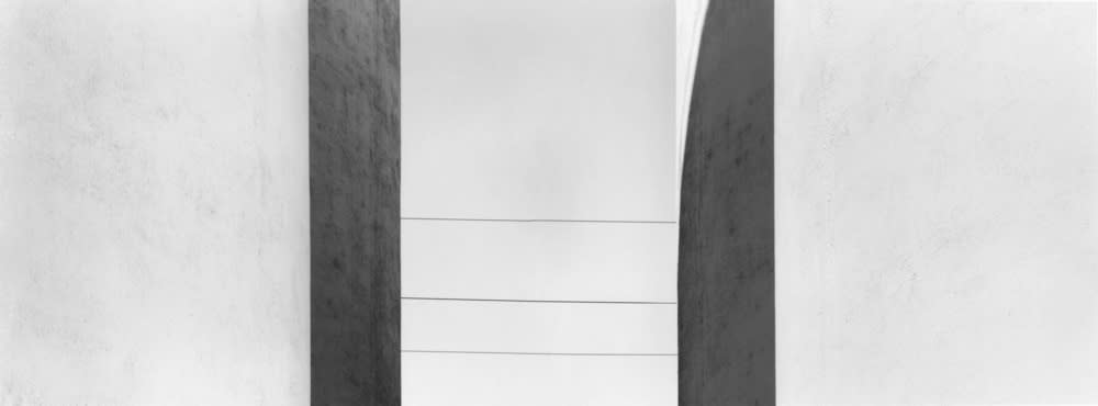 “Measuring Space”, a series by Lyle Gomes (4), is a “study of what we see and what we tend not to see – an investigation of spatial ambiguity.” His image “Silos, Arbuckle #2” was an interesting extension of his landscape work on dunes and his book “Imagining Eden” (5). In an interview with Karen Sinsheimer, he responded that he drew inspiration from Fredrick Sommer (for the elimination of the horizon line), Eugene Atget and Joseph Sudek (for their use of light and Sudek’s “panoramic” approach). In his earlier (and some newer) dune images, the contrast of light and shadow create an amazing abstract that sets the stage for what we now see in the image “Silos, Arbuckle #2”. Arbuckle is a small town in the North Sacramento Valley. It takes a moment to realize that we are looking at two large silos with some form of telephone or electrical wires passing in the background. It’s an image that many probably walked past innumerable times, never noticing this natural composition. It’s a wonderful visually-caught moment where the light is hitting the silos at the right moment to create the shadow cast we see in these images. The image has the look of a panorama, as is Gomes’ style, but it’s a straight image. In later images, he begins to stitch images together, and this image, he mentioned, was the “nudge to enter that world”. So, this image is relevant not only for the image itself, but for where it led him as an artist. This image also stands in contrast, literally and figuratively, to his prior work. In that same interview with Sinsheimer he commented that he would normally photograph on days with “fog, rain or falling snow… cloudy days..[for] soft, delicate, shadow-less light” to instill a certain “atmosphere” into his images. This image is shot on a rather sunny day, it appears, with sharp shadows and a very graphic appearance that almost denies readily understanding what you are actually seeing, other than as a black & white abstract of form and line.