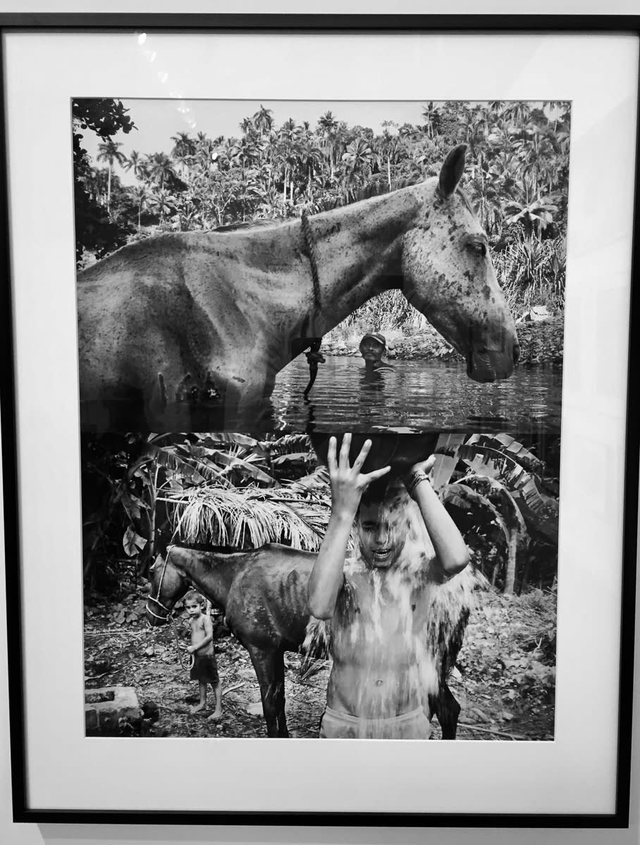 Cuba has a number of photographers now being discovered here in the United States. At AIPAD, there was a Special Exhibition of Cuban art from the collection of Madeleine P. Plonsker: “The Light in Cuban Eyes”. Among the work exhibited is the photographer Arien Chang Castán. The untitled work from his series “Campo, 2011” is a black & white digital print diptych. While both images are traditional photographic images, the combination into one visual statement is not. The young boy in the lower part of the image appears to be supporting the entire river in the upper image, with a small amount draining down over his head. In both images there is a horse, near and far. In the upper photograph, a man, up to his neck in water, is peering at us from beneath and behind the horse that is calmly enjoying the cool river water. Below, the horse is behind the young boy, but we also see another small boy beneath the head and neck of the horse standing on dry land. Within the combined image, we have many different spatial and human relationships that make this an exceptional visual composition.