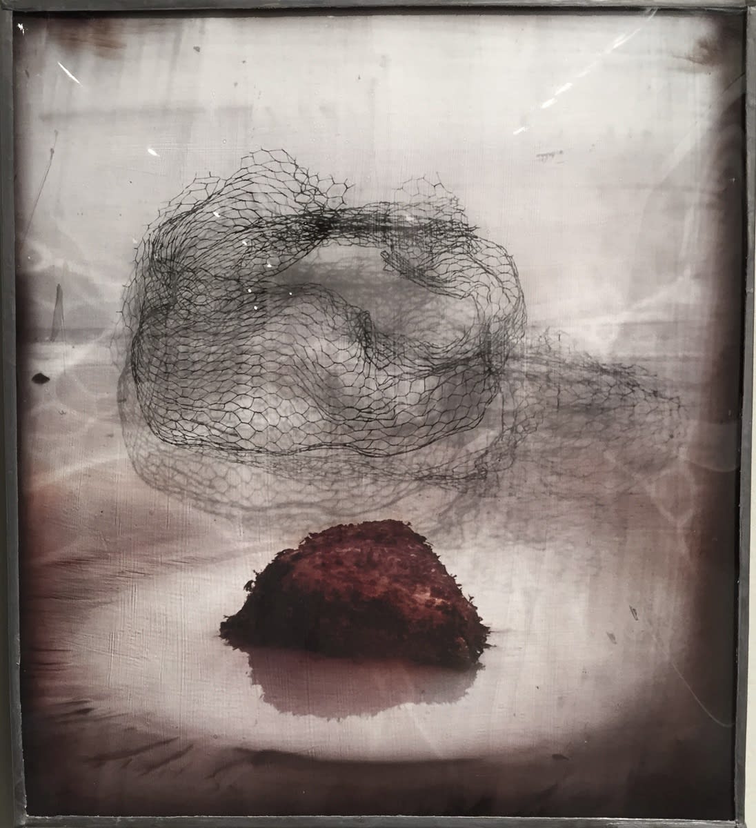 Some photography-based art pieces have to be physically seen to really appreciate the quality and visual perspective the artist has created. Originally from Poland, and now France, Gabriela Morawetz’s “Ideal Structures, 2012-2013” from her series “Away From You, Close to you” is a very physical photographic object. She prints and mounts a silver gelatin print into a frame. Then she prints another image on to a silver emulsion layered onto the inner side of a curved dome like glass bubble that is placed over the first image. The two images are sealed together with what looks like a soldered or molded lead metal frame like an old stained-glass window. Morawetz has created a dialogue between these two images. Again, this artist has encouraged the viewer to pay attention and look more closely. The viewer has to look at both and reflect on how and why these two images have been combined.