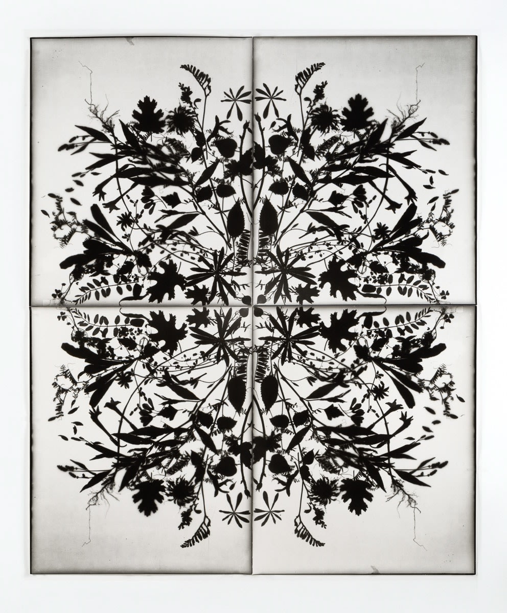 Older historic methods of photography have been resurrected and re-revisited by contemporary photographers over the last several years. The Wendy Small work from her portfolio “Remedy” shown below are large photograms. Photograms are created when objects are layered directly onto a light sensitive surface, exposed to light and then developed. “Remedy pieces are made by collecting leaves, weeds, or flowers from a specific place (indicated in the title) and placing those leaves directly onto photo paper and exposing the paper to light.” These images are made of four 20”x24” sheets. These are not digital. The exposed sheets of photographic paper are developed in a “wet” darkroom using developer, stop bath, fixer and water washed as analog images were made prior to the digital printing revolution. Ms. Small’s work in this portfolio is a very engaging contemporary use of an older photographic technique going back to the earliest days of photography.