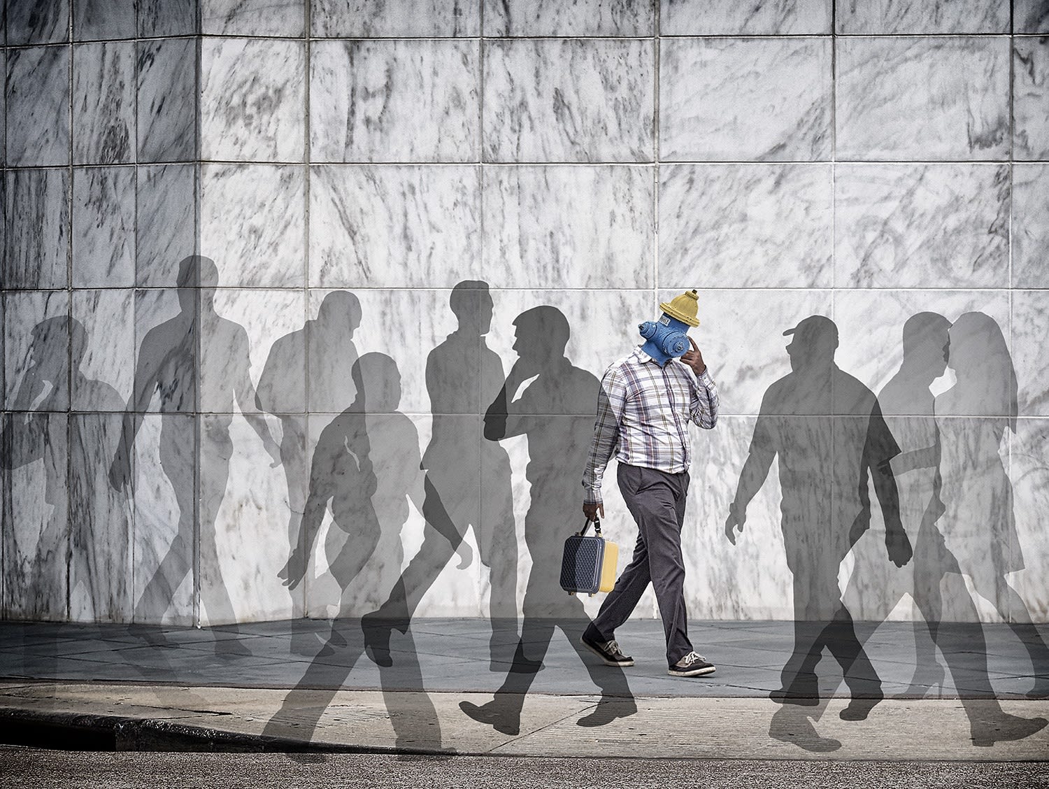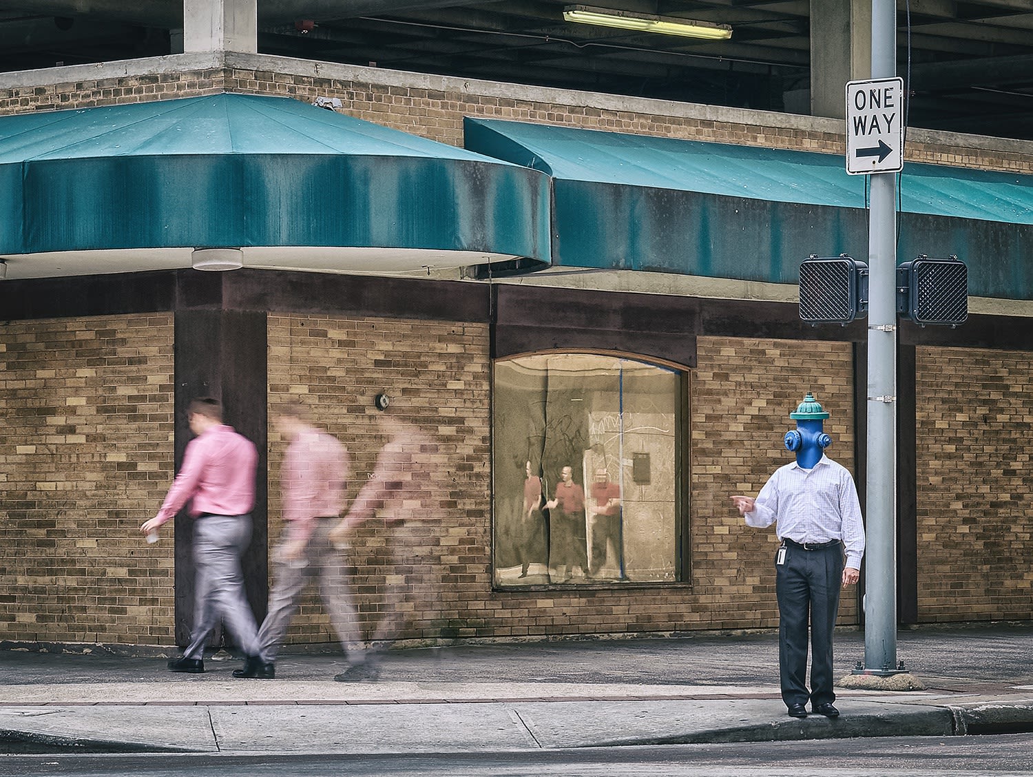 In the image “Adrift”, Holmes now adds to the background a mirrored image in motion, rather than just a wall or street scene. There is still a sign whichis an artist’ message to the viewer to consider. But there is a more fundamental change. He takes one of the figures in the image and makes a physical change, taking an inanimate object and giving it an emotional meaning as a replacement for the head on one of the participants in the scene. In this case a fire hydrant. His art is anthropomorphic – the attribution of a “human shape or characteristic to [an] inanimate thing”. (8)