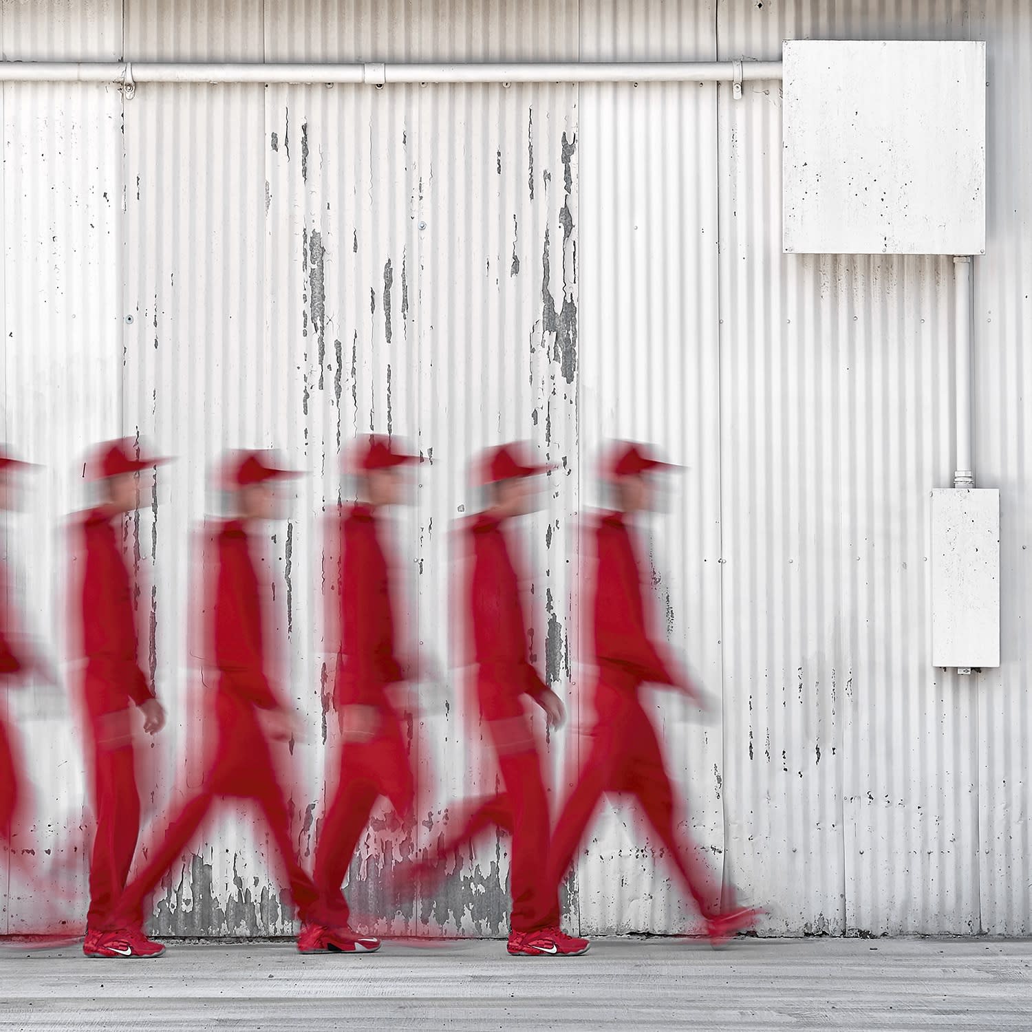 The next image image of this body of work, “M.A.”, is an image that takes us full circle back to photography’s origins. The work is only a single person, in motion , against a selected background. Holmes asks individuals he knows to dress in cloths of a certain color. He looks for a particular location with color characteristics that complement the dress of the individual in motion, not unlike a black background for the stroboscopic work of Edgerton or Abbott. The artist seems solely focused back on an artistic visual image, using the camera as a tool used in a traditional manner, again, without any unusual manipulation of the image; a straight forward attempt, even more straight forward than the very first image, “Don’t Walk”. Holmes went back to the very beginning, and in effect, took a step back from that. The image is still very effective, and more purely photographic than the others.