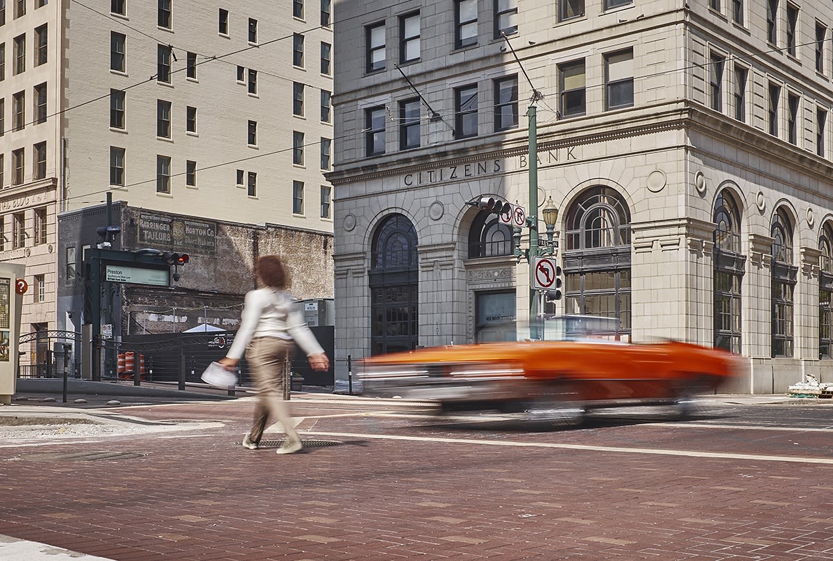 Holmes defied the conventional wisdom that all things have been photographed, as all photographers should. His interest germinated from a study of the streets of downtown Houston, Texas, exploring the creation of “streetscape” and “urbanscape” type images. While street photography is a classic and well known genre, he felt a need to express his own vision of what he saw and felt. One of his first images from the “Time Slip” series was “Don’t Walk”. Certain elements have been part of street photography for years: people rushing from place to place, responding to street signs and signals and avoiding cars, buses and trains. What Holmes captured was the frenzied pace of people within a composition framed by the downtown urban environment. We move instinctively between other people on the sidewalks and obstacles mechanically and by rote driven by a fear of time, delayed, interrupted and being late for our next appointment. These images visualize this pace for all types of people in motion on our streets.