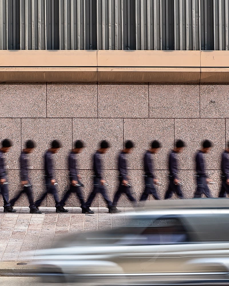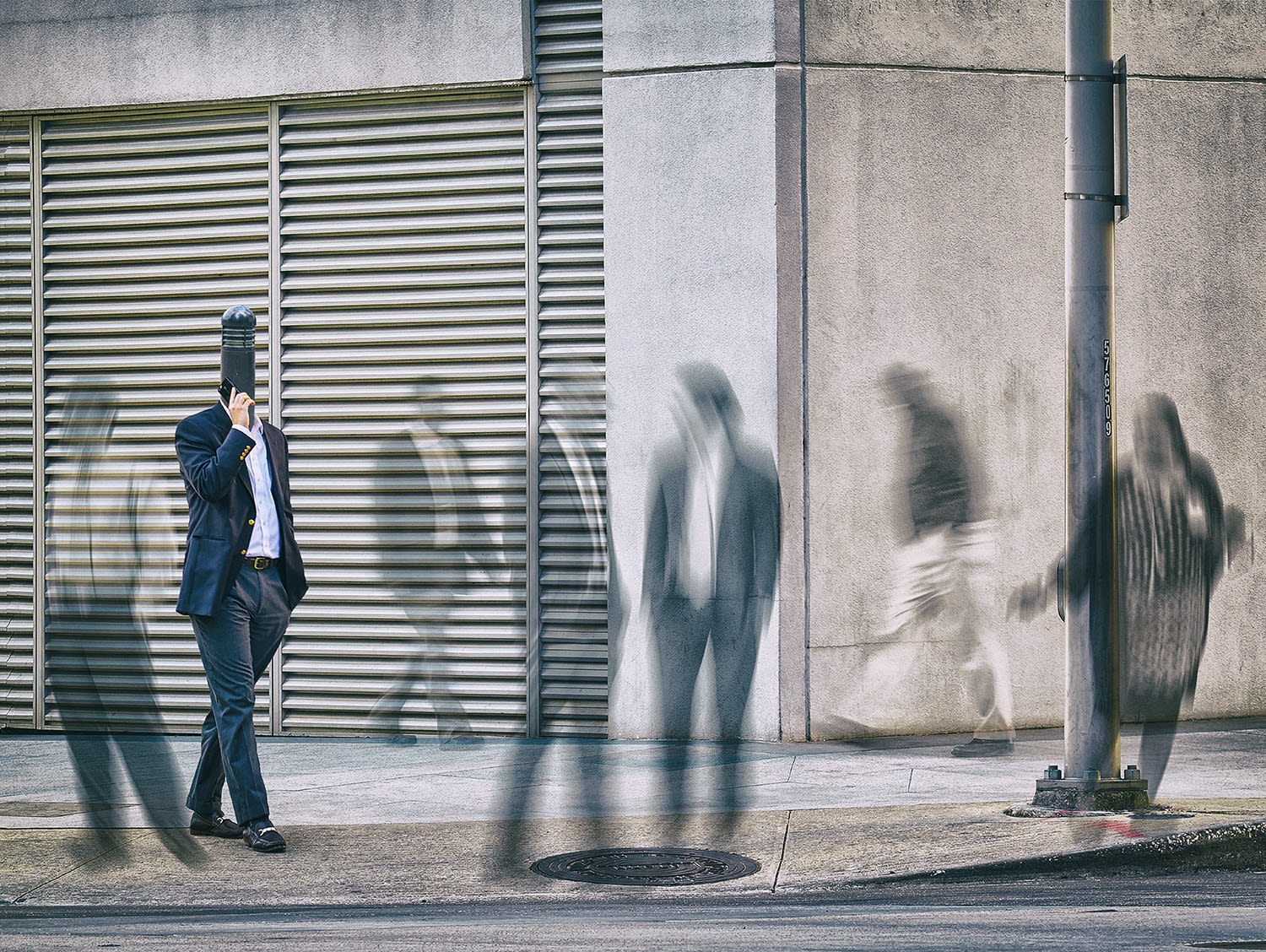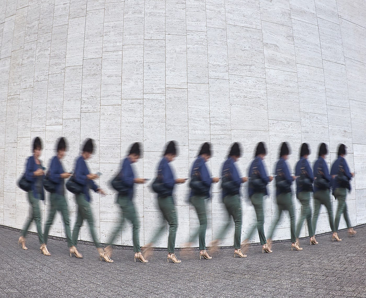 He continued the “Time Slip” series experiment with a group of images subtitled “Street Portraits”. The image now becomes a study of one person. Our actions on the streets of the city is a study in movement that is choreographed within the stage of the urban environment we walk through most everyday. The series “Street Portraits” is a study of movements on the street focused on our own gestures, the actions of those around us, signs or barriers that impede our progress. While we sometimes “walk in a daze”, we may also interrupt our own rapid pace by a phone call, a “pearl of wisdom” we want to capture and write down or a call we suddenly remember to make. The camera captures the visual pace and actions, parts of which are emphasized in post processing to examine our conscious and unconscious behaviors. The images reflect what we do and how we are controlled as we ping-pong from place to place in our ever more crowded downtown urban environment.
