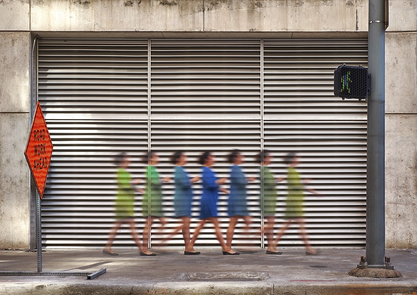 Holmes returns to fading the figures in “Impending Exposure”, but gives them a movement like distortion reminiscent of André Kertész’s “Distortions” work. (9) In this image, Holmes chooses to leave out an instructive street sign. His messaging is primarily the visual of actual figures of people in motion, although there is one inanimate object added to a person walking and talking on a cell phone.