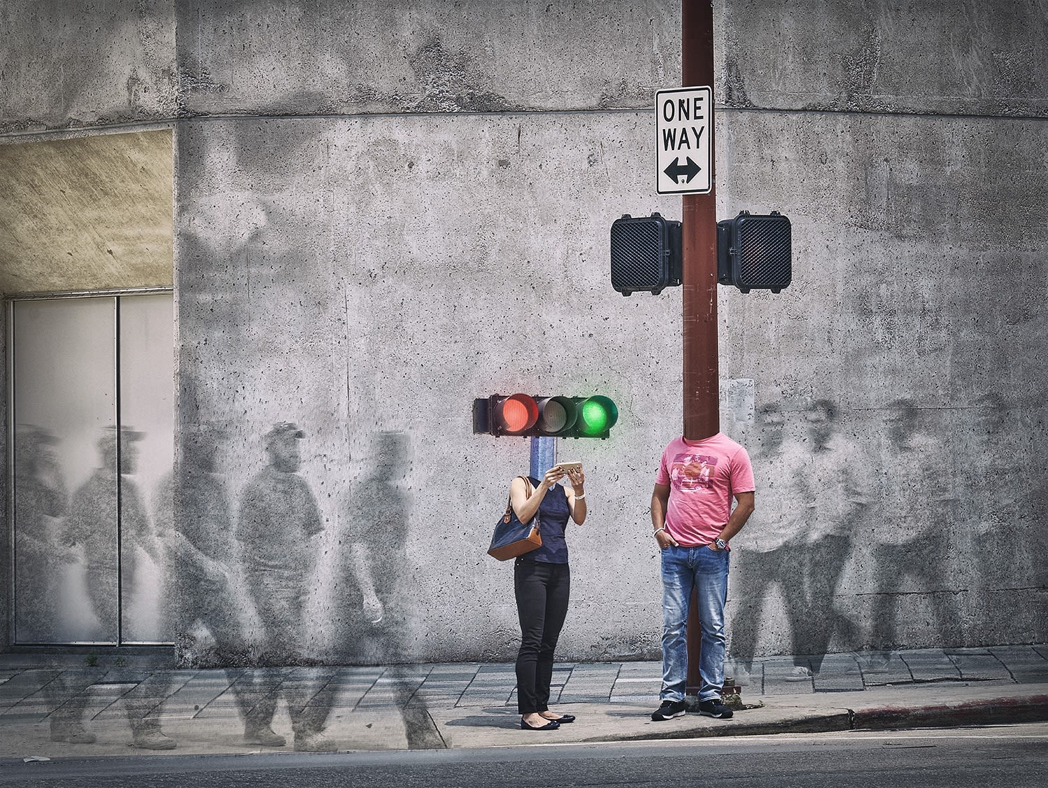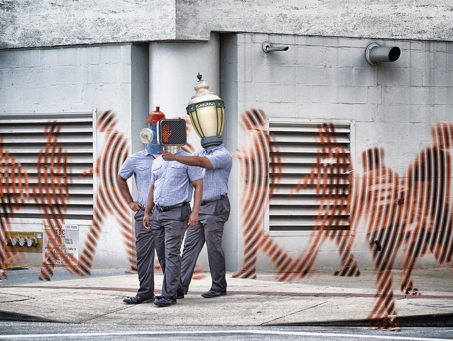 He then takes an additional step in “Recognizing Interference”. He returns to a neutral background to emphasize the people. The use of inanimate objects embedded into figures is continued as he had done in the image “Adrift”. But two new communications were added. Where before he had incorporated an unmodified street sign, a street sign is now added that has been manipulated to give an other than literal message. The other figures of people in motion are faded and made blurry. These other faded figures in motion are pushed into the background more as props to just remind us that the action is in an urban setting.