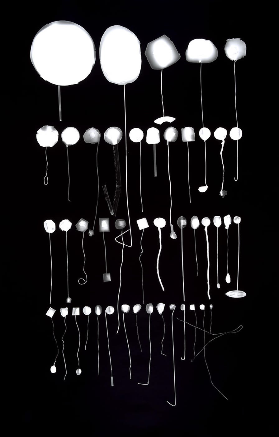 The “photogram” is a basic way to visualize and understand cameraless photography. “A photogram is a photographic image made without a camera by placing objects directly onto the surface of a light-sensitive material, such as photographic paper, and then exposing its surface to light. The usual result is a negative shadow image that shows variations in tone that depends upon the transparency of the objects used. Areas of the paper that have received no light appear white; those exposed through transparent or semi-transparent objects appear grey.” (4) HCP’s booklet for the exhibition has an introduction written by Ms. Anderson-Staley that states: “A photogram might seem simple – it is just a silhouette, made by preventing light from reaching light sensitive paper (or other material). It is a shadow. It can be made without a camera in a dark room.” Photograms are, indeed, not simple. Understanding more about this form of “photograph” and the questions to ask, will make the images in this excellent exhibit all the more impressive and visually satisfying. Of the 12 Artists (5) in the HCP exhibit, all, except three (6), have used an approach that can be defined as a “photogram”, albeit using very different techniques. (7)