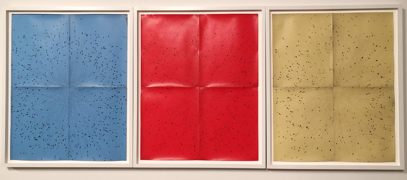 Several other types of cameraless works are included in the exhibition. A very unusual work included in the exhibition is a video, “Wake (2014)”, produced by Eric Stewart. His father had passed away and was cremated. His father’s ashes were then sprinkled onto unexposed 35mm film, the light turned on, and as the exposure occurred, Stewart hit the table with drum sticks to make the ashes move. According to Anderson-Staley, the drumstick represented a special relationship and bond between Mr. Stewart and his father, and so incorporating their use into the project had, for him , a special meaning. The 35mm images were then transferred on to 16mm movie film and turned into a video.
