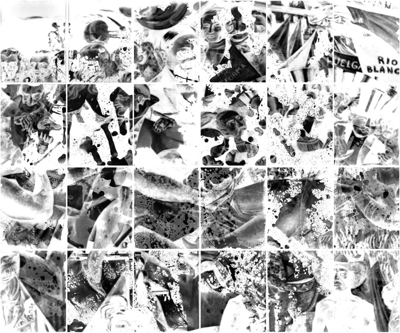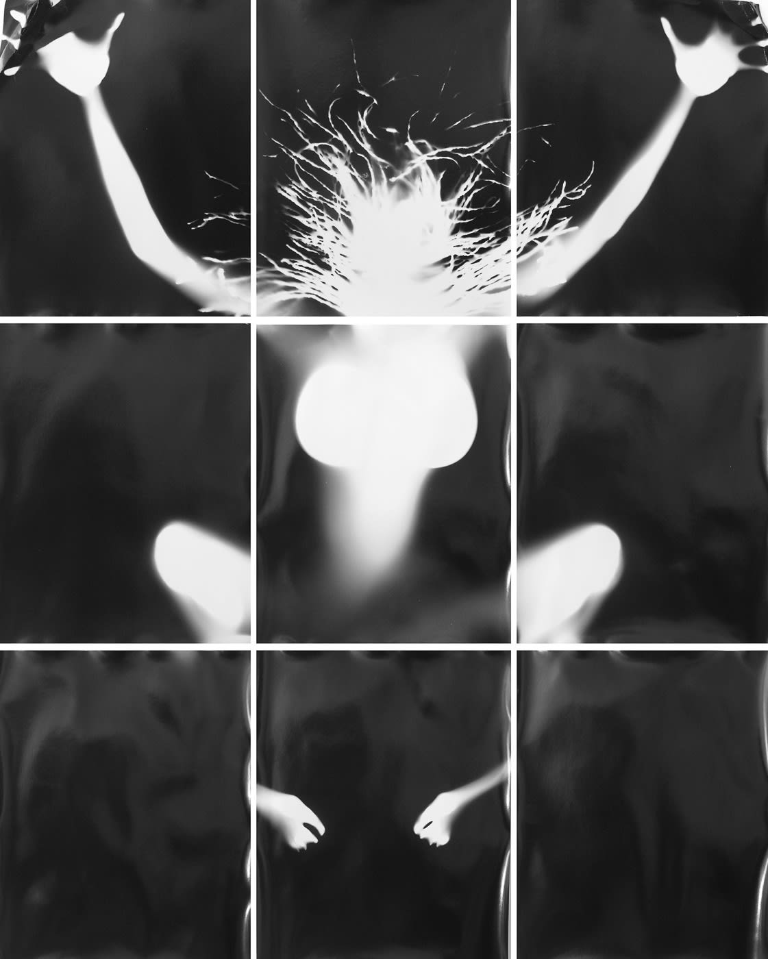 Tere Garcia created a 24 silver gelatin photogram paneled image, “Record of Not Revealing the Mural (2016)” through another novel process. She acquired an image of a mural that she projected onto the light-sensitive paper. Anderson-Staley further described the process: “Garcia interjected her body between the projector and the paper as it was exposed. … She sponged and dripped liquid chemical developer onto the separate sheet of photographic paper, producing her own hand-crafted mural.” In a sense, by the use of her body, she becomes the object that is on the photogram, albeit the mural is in the background. The manner in which the chemical is applied is another intervention that impacts the image.