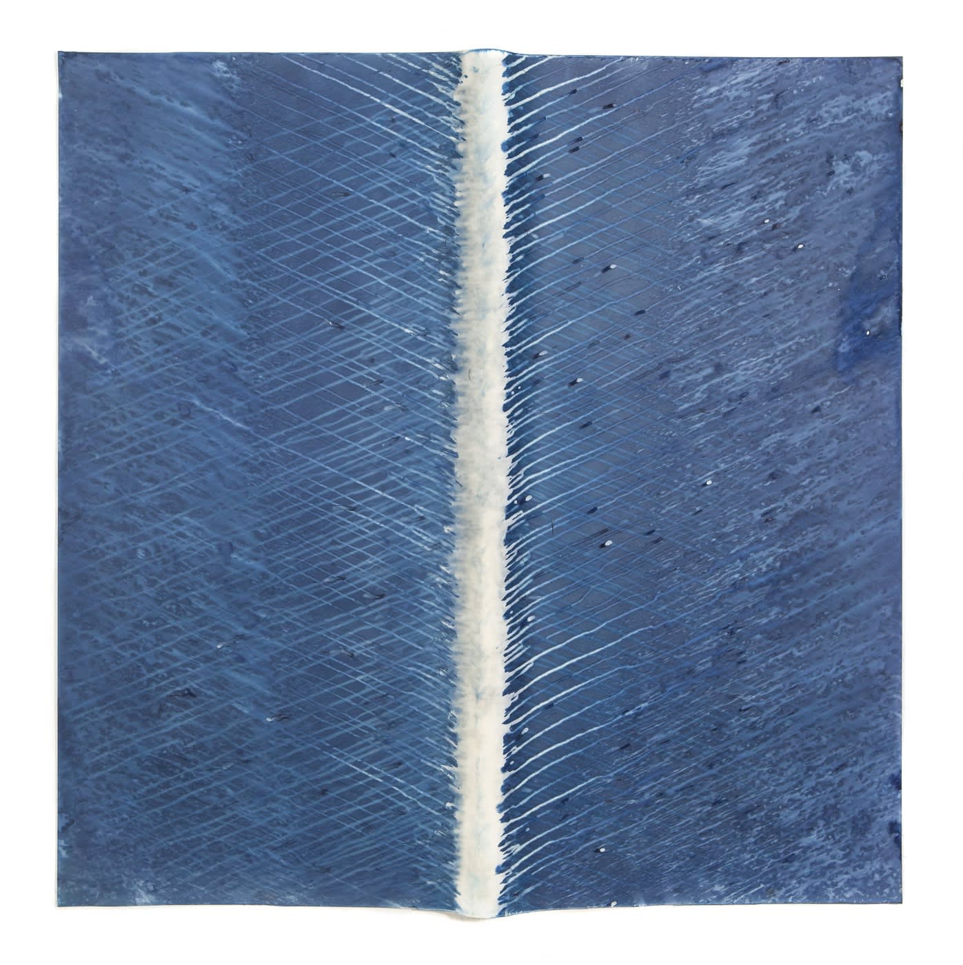 Meghann Riepenhoff has three images in this exhibit that she refers to as “dynamic cyanotypes”. She takes light sensitive paper and puts it outside in different places to interact with nature. For example, letting the paper sit in the rain to capture the impact of the water rivets on the paper and chemicals. On her website, there is a similar series titled “Chronographs”. Her artist statement from her website for her series “Littoral Drift” is remarkable and a great insight into what this artist has created: “…the series consists of camera-less cyanotypes made in collaboration with the landscape and the ocean, at the edges of both. The elements that I employ in the process—waves, rain, wind, and sediment—leave physical inscriptions through direct contact with photographic materials. … Photochemically, the pieces are never wholly processed; they will continue to change over time in response to environments that they encounter, blurring the line between creation and destruction.” (14) In the actual exhibition she is actually creating a cyanotype that is exposed each day of the exhibit creating a unique record of the light each day in the same place in the gallery. Each day a new page is turned and exposed.