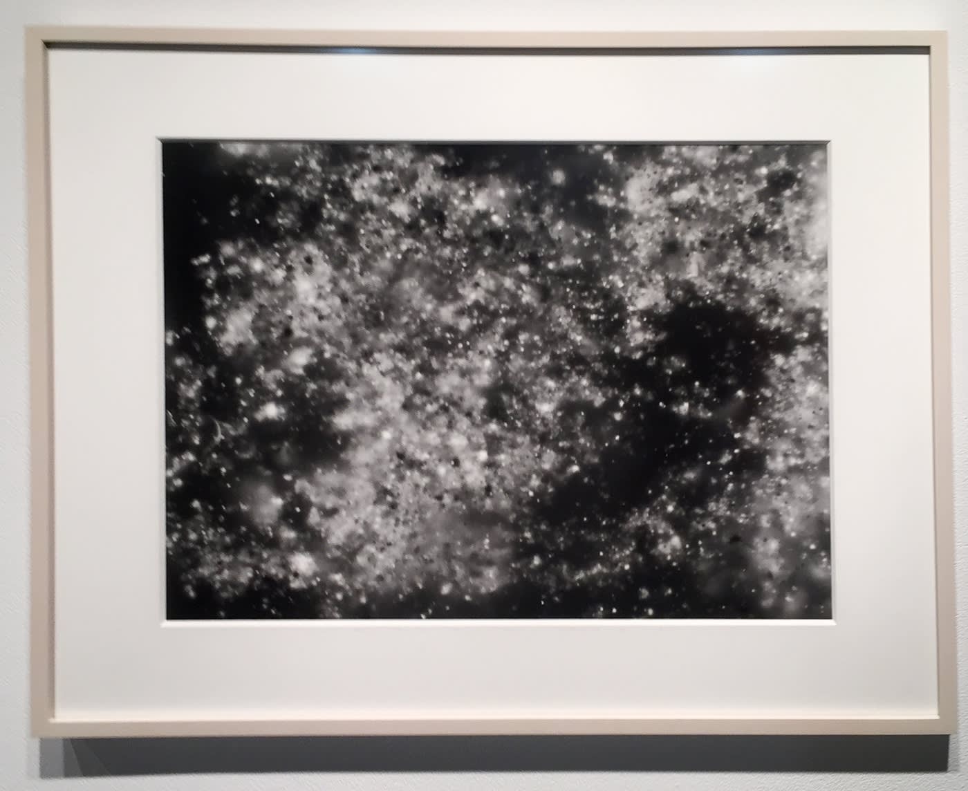 Alison Rossiter is known for her collection, and experimental work with, old film and papers. As these dated materials are exposed to the light, the outcome is uncertain. By exposing and developing these papers, the artistry is the unexpected images that one will get. Four of her works are included in the exhibition: “Agfa Ansco (1950s); Eastman Kodak Super Pancho-Press Type B (1944); Geveart Gevapan (1958) and Eastman Kodak Contrast Process Panchromatic (1961). The four photographs are from her series called “Lament”. On the Yossi Milo Gallery website, similar works are described in highlighting Rossiter’s work in her series “Paper Wait”: “Each of the unique, hand-made photographs in Paper Wait is a relic of photographic history and reveals the echoes of times passed. Alison Rossiter activates unused, expired photographic paper by pouring or pooling liquid developer directly onto the surface, or dipping the sheets into developer. The embedded histories of these papers are then reawakened, revealing fingerprints, light leaks, oxidation or mold in the photographic emulsion.”