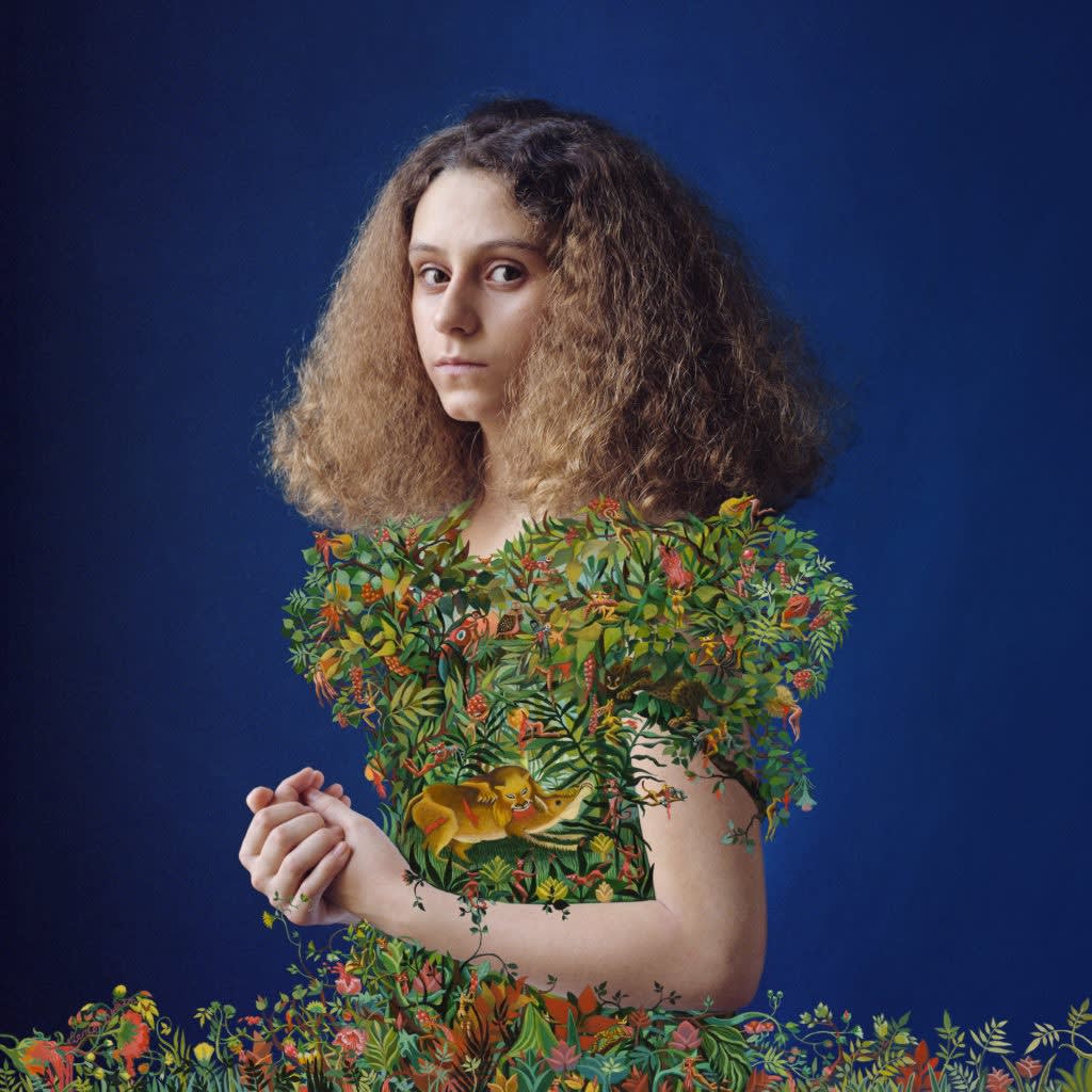 Elene Usdin, a photographer, illustrator and multimedia artist, was also exhibited at Galerie Esther Woerdehoff. As with the other images discussed in this commentary, the artist has used photography, but stretched its traditional use and presentation to create work that moves into new territory. Usdin manipulates images by painting on to the image’s surface. She has many other bodies of work and often includes herself as the subject of her images. This series is very different from her other works in that she has chosen someone else, other than her self, to be posed as the subject of the image. She then chooses the work of another artist or painter to mimic their technique, painting on the image in their style and/or using creatures that this other artist might have used. One gets the impression that she matches the posed subject’s captured mood with the type of creatures associated with the other artists she mimics. It’s an interesting extension of expression from a documentary portraiture style of photography into something else. We see enough of the seated person in the image to sense who they are and how they are feeling at that moment. In the image “Adèle d’après le Douanier Rousseau” the mimicked artist is Henri Rousseau. In some cases, she creates a border around the image, entirely or in part. The painting of floral, fauna and fanciful creatures complement and expand on expression of the subject in the image.