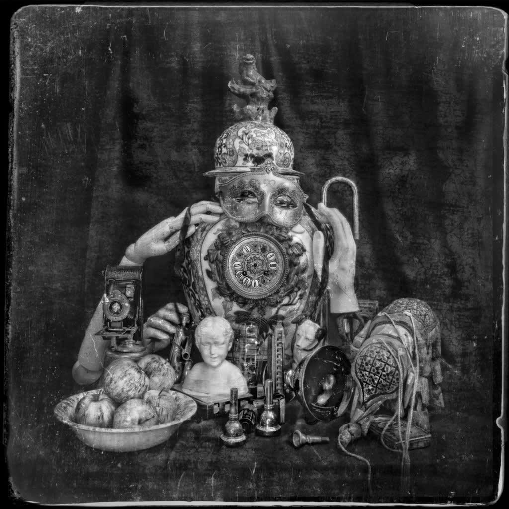 In his “Still Life” series, Frumin makes an assemblage of objects, that are difficult for a viewer to appreciate outright. This is with purpose. He wants the viewer to seek their own explanation for the image in its parts and as a whole. In this still life, “Illusion of Past Happiness”, Frumin points to a sense of time in the central placement of the clock; the limited time we have in life. He makes his cynicism evident with the elephant, a strong powerful creature, that is shown as a puppet in this image. There are parts of a musical instrument, evidence, that music might exist, is silent and disassembled. Prosperity, represented by the fruit, will rot because there is no one there to eat it. The mask, evidence of a person, is not a real person, as people hide behind masks, and there as there are hands to hold and help, that are fake, and provide no assistance. In Hoffman’s stories there was a guardian or champion, like the Nutcracker in the ballet by Tchaikovsky, to come to life and help. (12) So Frumin places the child into the image with the dog, man’s best friend and guardian. But there is a darkness to the story told by this image. The camera in Frumin’s visual allegory, symbolizes the belief at the moment of death, one can see the other side of life, in this last slice of time recorded in this world. What Frumin does in these still life images is to force a viewer to examine each object closely and think about what each piece represents and how the parts work into the whole. Flores and Mosquera, curators of an exhibition on Bravo, wrote: “the photographer seems to be using pictures to ask himself questions about the relationships between images and words, bodies and objects”. (13) Frumin asks a similar questions. The clue in Frumin’s work for understanding these still life assemblages is appreciating his passion for looking at life on the margin’s of society and his cynicism about how many people live their lives.