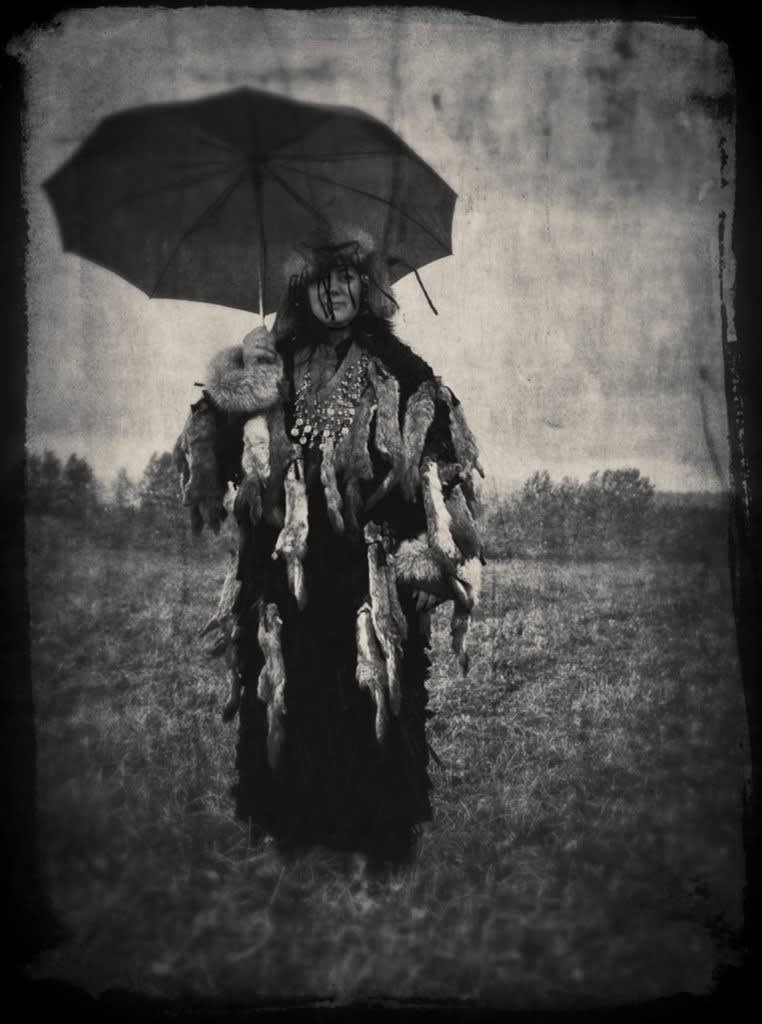 The image “The Shaman”, from Frumin’s “Russia” portfolio, is an image that melds time, location and culture. Like Bravo, Frumin appreciates the soft, not too contrasty style, in which Bravo’s images are shot. Frumin said that for him, Bravo chose the technique to support his subject matter; something very important to Frumin. For Frumin, its critical that he feel his technique is in support of the image. He feels, as other commentators have also expressed in referring to Manuel Alvarez Bravo’s work, that Bravo saw what others did not. Surrealism was a strong influence for Bravo, which is also an influence evident in Frumin’s work. This image was taken in a remote region of Siberia close to the Arctic. The Shaman is a person who actually practiced a very real mysticism that the people in this region very much believed in. This woman was sought out for dealing with an entire range of issues from healing to marriage counseling. Her “magic” was considered more relevant than traditional medical facilities, and in this remote area, easier to access. Frumin was attending a “gathering” of indigenous people from the different villages in this area, an event that occurs every couple of years. This woman was crossing a field toward Frumin in a light drizzling rain covered in a bear fur coat hung with squirrels carrying an umbrella. Somehow there is something surreal in the sorceress in her world of incantations walking around with an umbrella that symbolizes a more traditional modern era.
