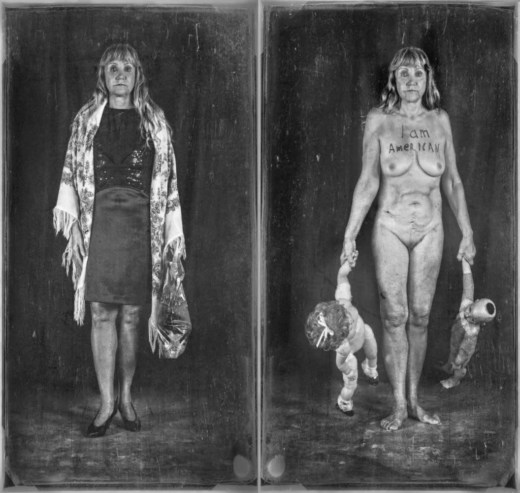 This cynicism is very evident in his series “I Am American” that was chosen for exhibition in London at the 2016 Sony World Photography Awards. (14) These images contrast people from different countries, backgrounds and intellectual levels that now call America home. The people are shown with and without clothes to emphasize that despite their common humanity, they are more different, than the same. Clothes convey a message about who we are, and create certain stereotypes, and that is not what these images are about. Without clothes, the viewer is only left face-to-face with another human. These images are a visual expression of the common saying “that one size does not fit all”. The viewer is engaged to accept that these are Americans, as they have labeled themselves, tempting a familiarity and commonality between the viewer and the person in the image. It is commonly said that America is a “melting pot”, but this is true only to a degree. Yet, as each person and the objects with which they engage are different, the viewer needs to accept and tolerate differences as we do daily, because we are, after all, all Americans. But we also exist in a world community demonstrated by the visual differences in these people; but this “I am American” portfolio focuses only on the American people and our society (The viewer’s dialogue with these images may be totally different if the viewer is not an American.) We can also see the influence in these images of Joel-Peter Witkin, another photographer that Frumin studied. “Mr. Witkin’s photographs depend for their effect on their ability to attract and repel at the same time… Mr. Witkin tries to shape the meaning of his pictures through his use of props and costumes and his alternations of the prints.” (15) While Witkin has a very different agenda and subject matter, I can imagine that these comments could have been describing Frumin.