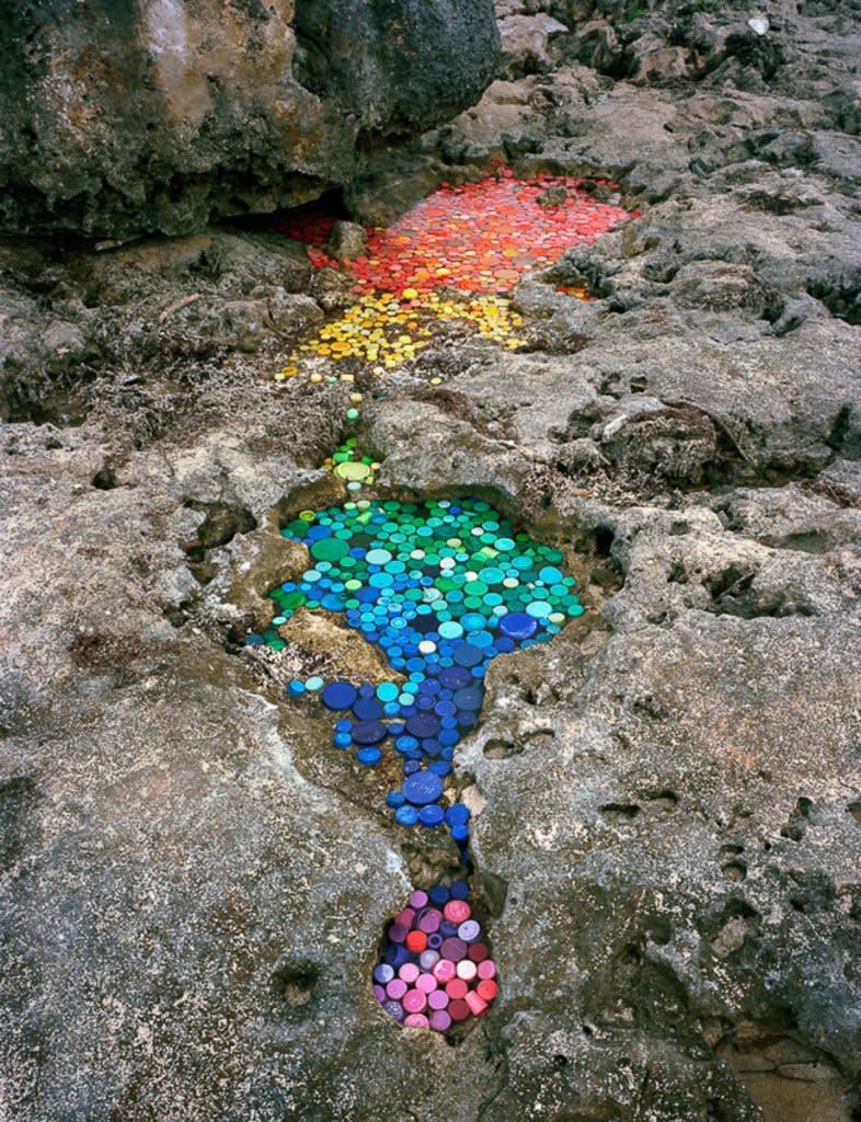 Durán began the project in 2010 like a giant “shoutout” as to what is washing up on this beach from the more than 50 countries so far identified. In a not yet released film of the project, the scientists who were interviewed suggest that an estimated 269,000 metric tons of plastic waste are floating in the oceans. (17) The plastic finds its way into the global food chain and ultimately into our own systems from the foods we eat that are contaminated by the waste. Alejandro even created a venue on the beach for school children to learn about this environmental disaster- “Museo de la Basura” (A Museum of Garbage). His work visually transforms these accumulations of trash into something of visual beauty. Although the colors of the plastic bottles, toothbrushes, and all manner of other objects made with plastic are embedded into the landscape with vibrant color and placed into beautiful patterns, the reality is that this pollution is poisoning the global ecosystem. It is this artist’s visual warning sign of what and how much we consume and that we need to change our habits of creating and handling waste.