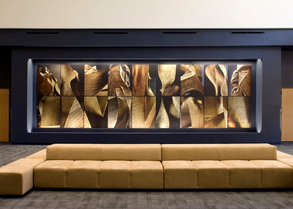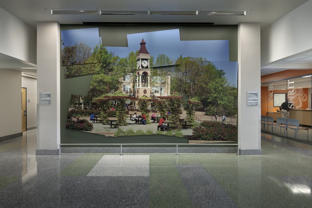 Its important to listen. Understanding what the buyer says is critical. In the image of the Sam Houston State University-Woodlands Campus, it was important that an image be created to give a sense of the campus, its history and important events. It had to be of a size appropriate for the space and the people who would see the image each day. It was constructed of multiple panels, juxtaposed in a David Hockney (6) like abstraction to transition it from a traditional wall mural to the custom art installation it became.