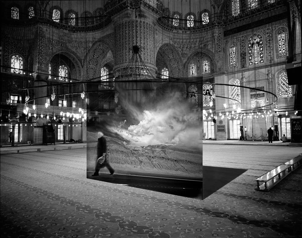 His third image, and last of the series that this Commentary will cover, is titled “Sacred”. Because of the title, we assume the space is a church, temple or mosque. There is a lack of images in the windows commonly associated with a Christian Church with its stained glass windows and representations of Saints and scenes with people from the bible. There is also a lack of pews or seating that would be found in different arrangements in a church or temple. The large hall in the image, and the calligraphy on the walls indicates a mosque. (13) Very evident in the center of the image and the space depicted is a large light or chandelier, which may also be characteristic of a mosque in this sort of configuration. (14)