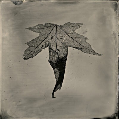 Gayle combs the beaches and enjoys long walks to finds objects to “photograph”. Since early 2008 she has used a wet plate collodion photogram technique on metal and glass, a process developed in the early 1850’s. The “finds” from her walks are what she places on light-sensitized material which is then exposed to light to create a darkened image. The images include a leaf, twig, frog, fish, dandelion or other objects, not all small, as some are as large as a pelican.