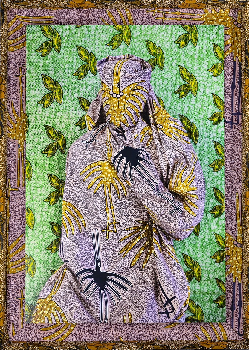 Why Flux?  In this series, Ali directs our attention to the interface of colonialism and the preservation of heritage during these periods of different periods of change. The title “FLUX” derives from “the textile as a document in which politics, economics and histories collide” and their fluidity over time. These FLUX images originate in West Africa with each frame hand-upholstered with wax print sourced from Côte d'Ivoire.  In FLUX, visually, there seem to be two broad styles of fabric pattern. The first, as in “Avian Blush,” the figure wrapped in fabric is clearly set apart from a background which is complementary. The lilac colored fabric is finally textured with a stylized bird image positioned in front of a green leaf covered fabric. Some of the images are paired by reversing how the fabrics in the image are used by reversing what is worn, and which is the background. This is the case with “Sojourner Flex,” where there are similar fabric patterns to “Avian Blush,” with the green leaf fabric worn, and the lilac bird image fabric in the background. The fabric wrapped on the frames is also changed in a similar fashion.  Alternatively, in other FLUX images, the figure is camouflaged against the background of the same fabric they are wearing.  Today, since the wax print process was appropriated by others, one has to now question whether it is authentic from its original source in Java, in Cote d’Ivoire, or is it Indian, Chinese, Dutch, or from somewhere else in Africa.  As Ali explains, “In the mid 19th century, the Dutch would engage new technologies to mass-produce wax fabrics to sell to the Javanese market. The look of the batik would be seemingly similar, ultimately different in that it was not as refined as the labor-intensive handcrafted textiles made by batik masters in Java.”  This spread of fabric is evidence of a dilution by colonialism of culture as these materials are transported around the globe.