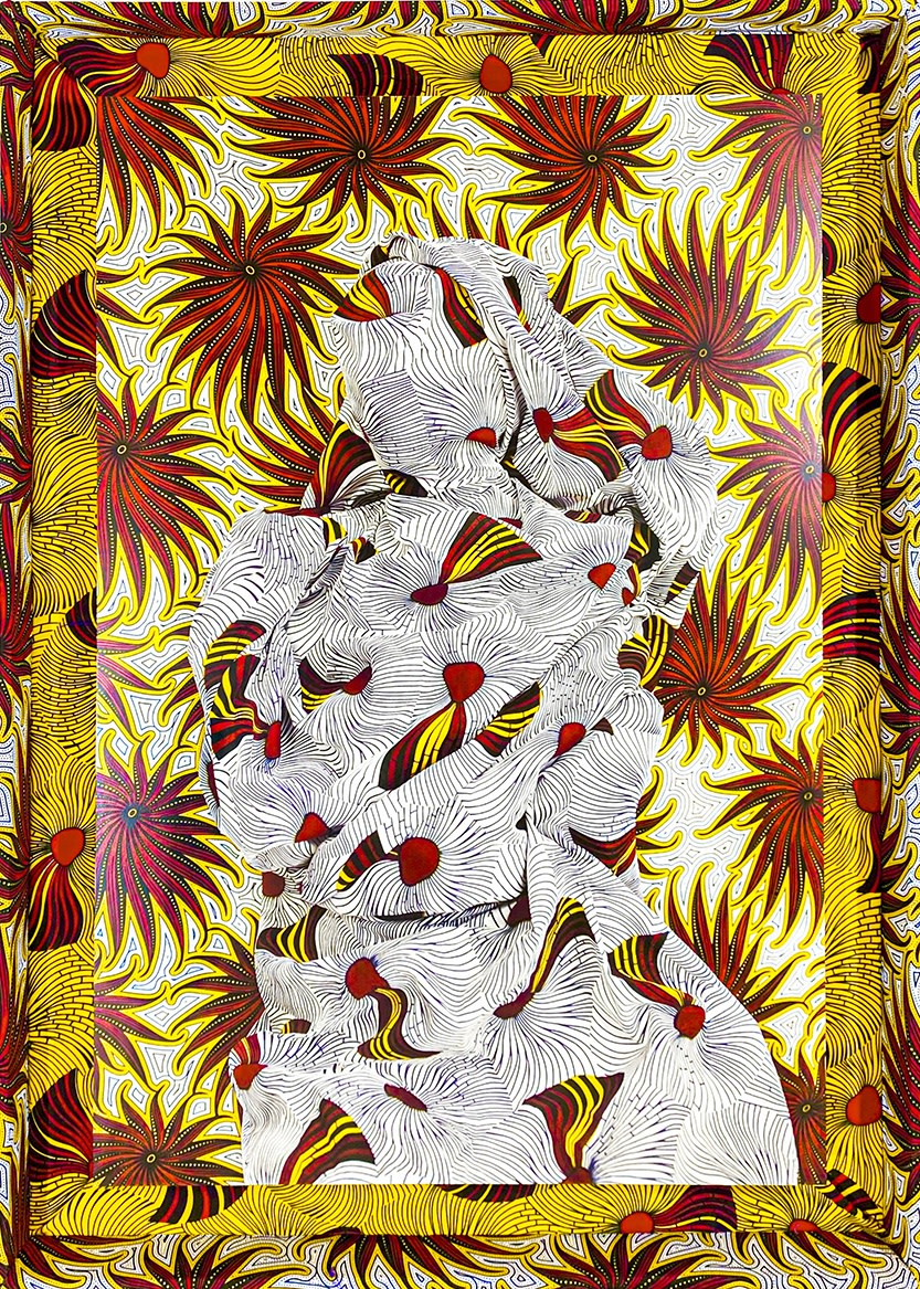 The Migration series of works that are ALi’s expression for the movement of people forced to move across borders.  The image title “Cosmic Vibrations” is inspired by the Sun Ra and June Tyson lyrics to “Enlightenment.” This image, as other images within Migration, are explosive in pattern and color. Sun Ra looks at Afro-Futurism that imagines different futures for the African diaspora through technology, fantasy and a science fiction minded approach.   This expression of Afro-Futurism also relates to Ali’s own thoughts and practice about Yemeni Futurism.  Both movements imagine what a future might be if the present could be revisited and changed.  In “Cosmic Vibrations” we see a figure engulfed in a tightly held fabric of black lines traversing a desert-like expanse of a white base with red/yellow shuttlecock-like objects patterned across it.  The figure appears in a defiant stance with an apparent confidence against a dramatic pattern of red floral plant-like imagery against black lines crossing over a yellow base. We can imagine a sense of movement as if we too are in migration. What Ali also does with these Migration works is to provoke our imagination of what sort of place and environment these figures exist?  She comments that a futurism movement imagines “reorienting their audiences to expansive thinking beyond this world, fraught with trauma of war, colonization, incarceration, slavery, apartheid and genocide.”  Where BORDERLAND speaks to us about boundaries, and FLUX focuses a viewer on the cultural appropriation of colonialism, MIGRATION takes the audience one more step in understanding the challenges for people who willingly or unwillingly move across borders.