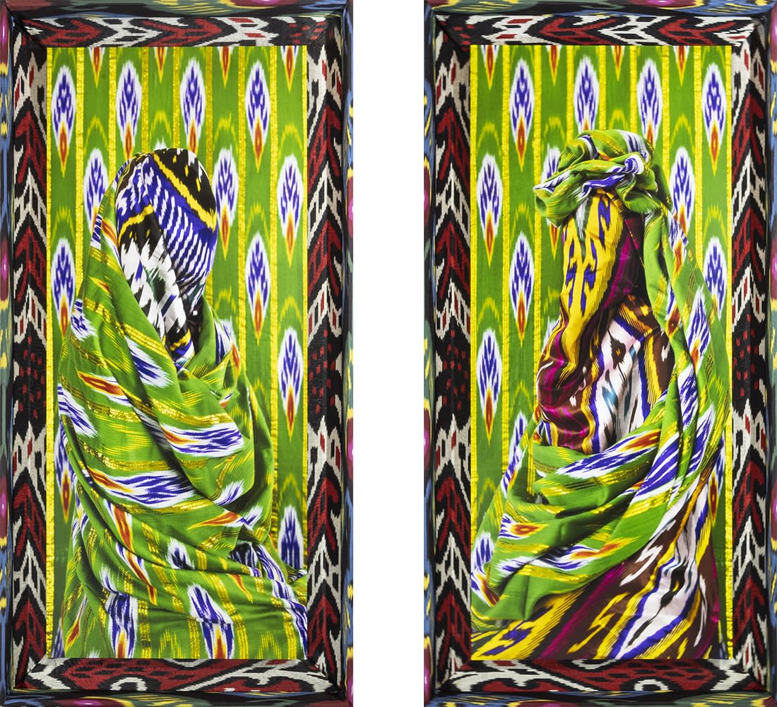 ©Alia Ali, Left: Jan, FLOW Series, 2021; Right: Jin, FLOW Series, 2021, pigment print with UV laminate mounted on aluminum dibond in wooden frame upholstered with a blend of cotton and silk ikat sourced from Uzbekistan, 55 in x 27 x 3 in // 140 x 68.5 x 7.5 cm (framed), Edition of 5 + 1 EP + 1 AP