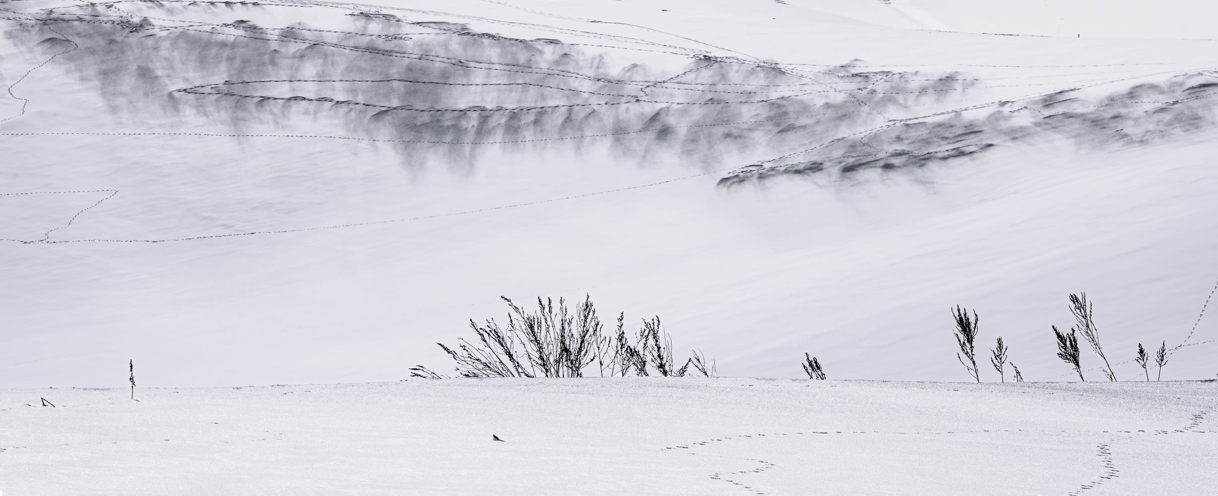How we engage with Ng’s images is also dependent on how we ourselves, engage with looking at our natural surroundings. The quality of engagement may be elevated by our willingness to be open to the symbols and markers within a landscape. Our ability to “see” is filtered through biases. There is the expected landscape, our preconceived notion of a place, where we’ve been or are familiar with, from whatever sources. From that preconceived notion we approach the image colored by what we think we know. If we see snow or fog or mountains, certain stereotypes of similar places or people we know may prevent us from “seeing” what hints or allegory is there. Is it a pristine landscape or is there evidence of mankind’s footprints that reflect and measure the passage of time? Are we open to the visual suggestion of others or do we compartmentalize emotions of “seeing” at someone else’s suggestion? Ng’s work is a transferable depiction of land and space, imprinted, not memory, that forces open our eyes.