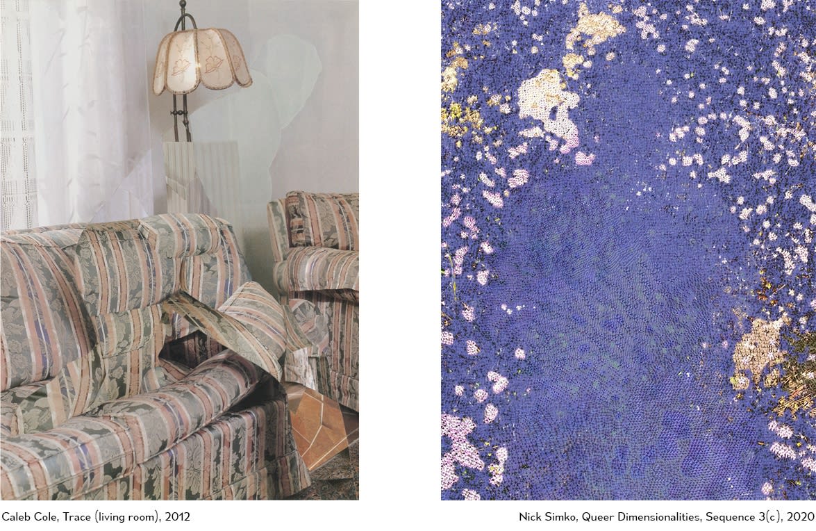 Caleb Cole, Nick Simko, and Gabriel García Román each tackle concepts of identity and queerness through the lens of their own unique experiences. Having grown up with a passion for thrifting and second-hand objects, Cole’s work reflects a deep desire to connect with histories lost to time, stories that are just as personal as they are collective. Simko’s interest in intersections of technology and authenticity tie into this discussion of recorded histories, questioning what is missing from the narrative and how much of that which remains is artifice. Simko also seeks to test the limits of photography’s ability to express his own queerness in textural, spatial, and atmospheric ways. García Román’s background in the Roman Catholic church inspired him to co-opt the aesthetics of traditional religious iconography to elevate individuals who are underrepresented and often pushed to the margins of Western communities.