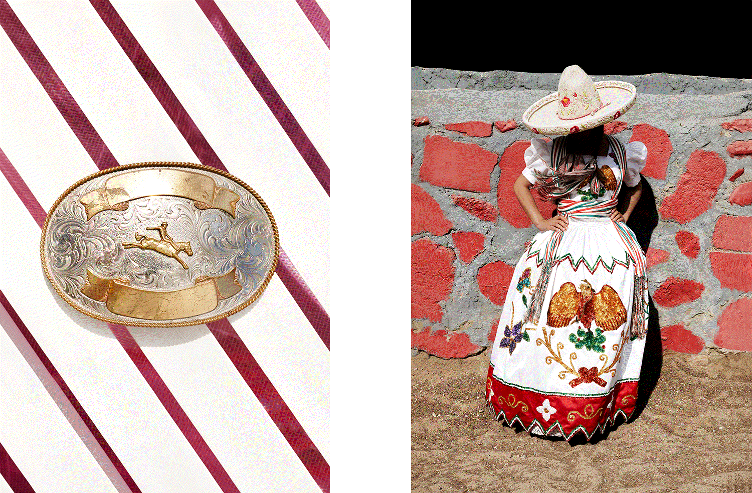 Newberry presents three archetypal characters in Smoke Bombs and Border Crossings: the cowboy, the charro, and the soldier, expressed through costume and uniform. Newberry’s photography has long centered around the role costume plays in defining identity. In this series, Newberry meticulously selected pieces from her extensive collection of wardrobe. Hats create sharp shadows covering the eyes of the subjects, and ornately embroidered western shirts are accented against softly colored backdrops. These character studies are reminiscent of a less gritty Spaghetti Western, in the moments during a standoff where tension builds as the film focuses tightly on the gunslingers’ faces. The charros and escaramuza charras in the series wear their own traditional regalia. Charros are Mexican horse riders who participate in charrería, the national sport of Mexico, a longstanding cultural tradition similar in format to the rodeo. Escaramuza charras are female riders who compete specifically in synchronized maneuvers on horseback. Their dresses are inspired by and are a direct reference to the Adelitas, and that is the role they play on Newberry’s stage.
