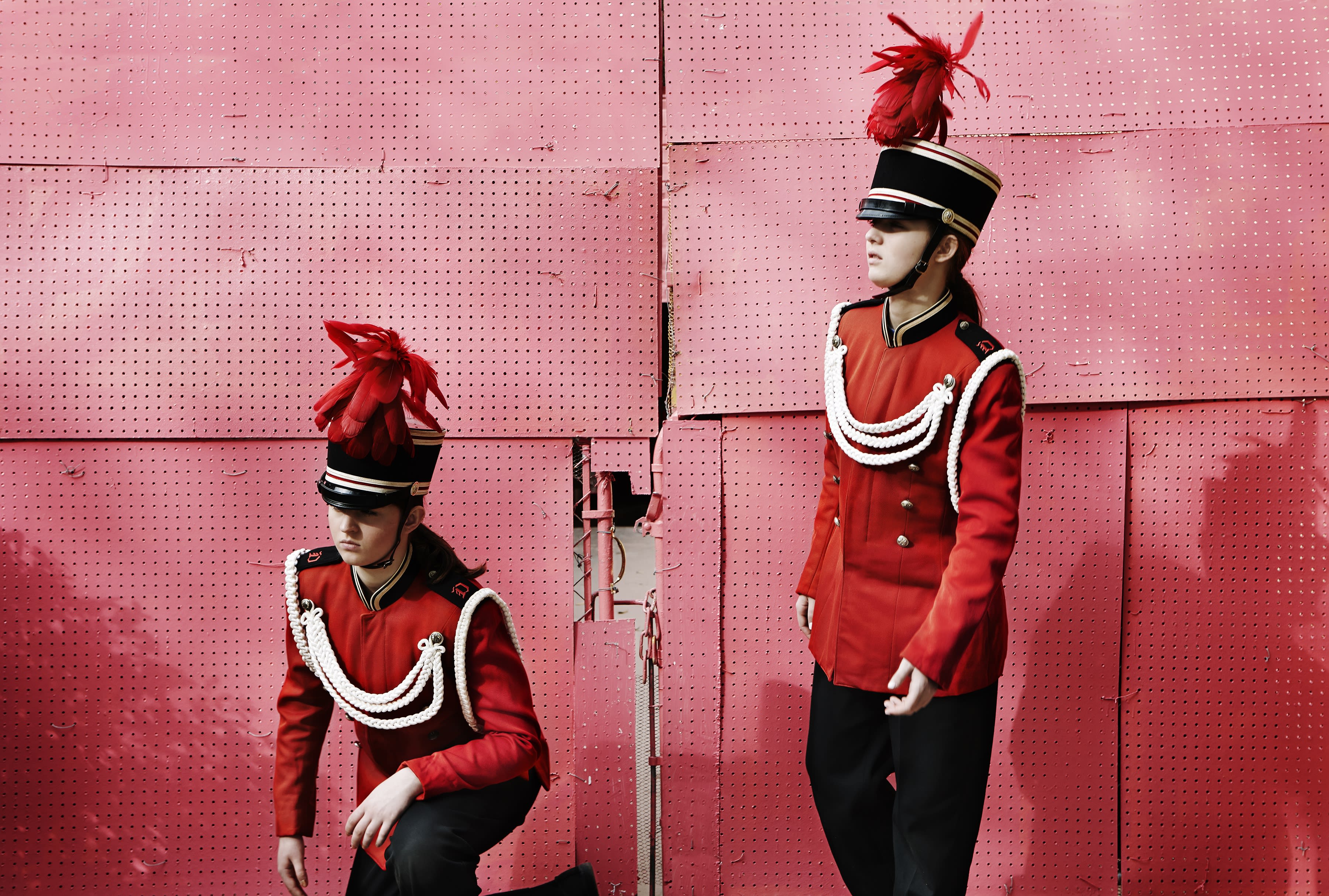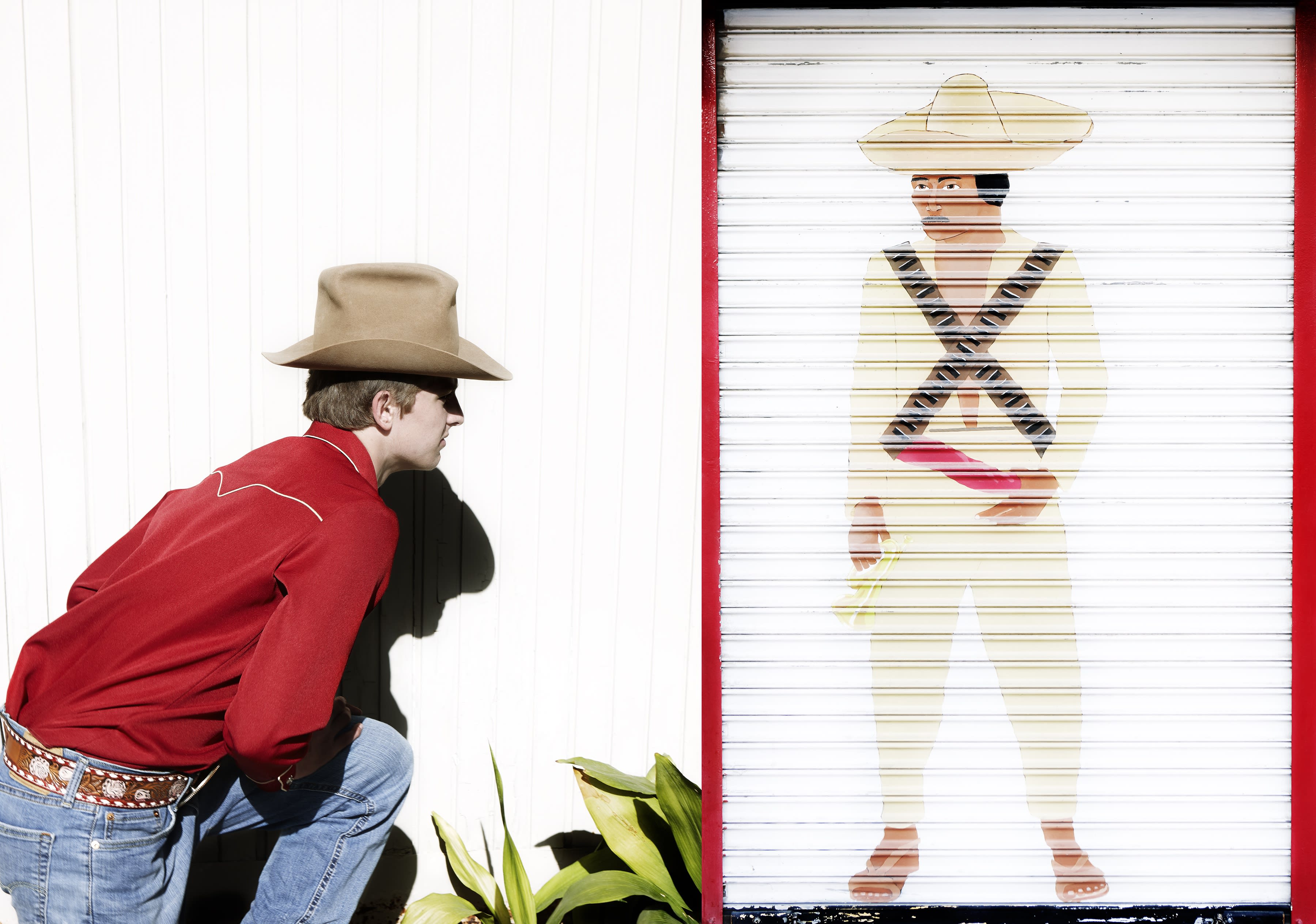 Bright colors accented by deep shadows draw us in to a Western stage of Nancy Newberry’s creation, Smoke Bombs and Border Crossings. Influenced by her Italian heritage and her Texan roots, the photographs in the show function as a contemporary Spaghetti Western, investigating the spectacle at the core of the Wild West. With meticulous attention to costume and uniform, the director artfully stages scenes of archetypal characters - American cowboys, Mexican charros, and soldiers costumed in marching band uniforms. Newberry’s work investigates the artifice and the real, the mythologies and the histories, the actors and the stage.