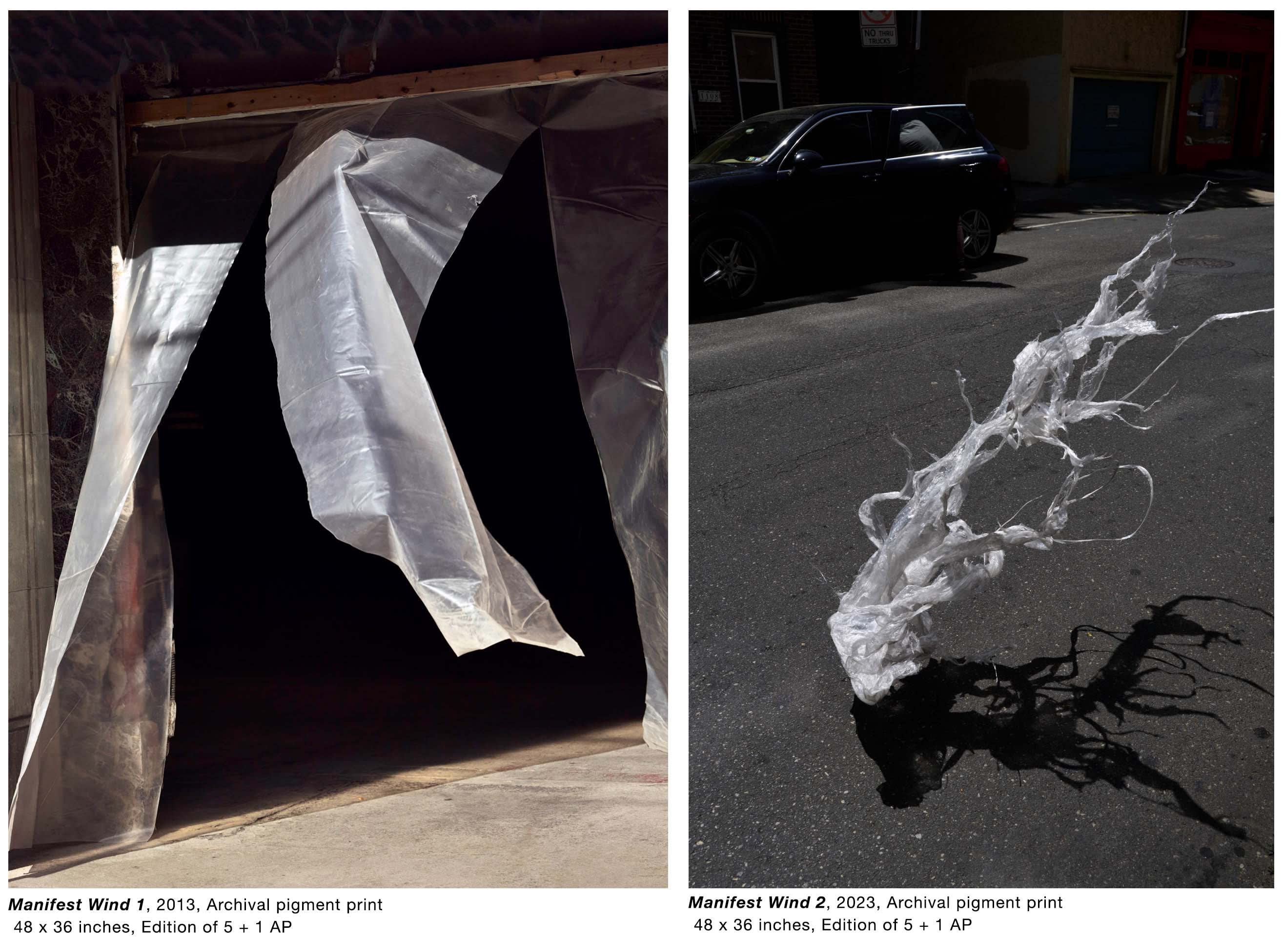 In Manifest Wind 1, Reinfeld’s careful eye catches wind blowing through a plastic sheet covering an entryway, while Manifest Wind 2 captures a dynamic, almost sculptural mass of plastic seemingly suspended over the street. These images could remind the viewer of Aaron Siskind’s famous series Pleasures and Terror of Levitation, where divers are caught silhouetted in different positions against a blank, empty sky. What would otherwise be walked past and ignored becomes an invitation into the dark space beyond. We have no idea how long those sheets have hung there, and where the door leads. The wind has caused the plastic barrier to open as if to invite us into the unknown. This is so often how we experience the city, especially a city as old New York, with its many layers of structures almost waiting to be excavated. The image is a reminder that through each portal and behind each wall there is a history of something constructed, destroyed, or suspended in time, the former inhabitants long gone, spaces abandoned and refilled, holding memories lost to time. Manifest Wind 2 is a companion statement to Manifest Wind 1 that speaks to life in a large city like New York. Unlike the plastic sheets hanging with some purpose in Manifest Wind 1, our subject is discarded plastic, floating into the street as a beautiful moment of elegance and at the same time a statement of waste, pollution, and environmental hazard. It is a combination of beauty and threat. The contrast between the two images highlights decay and change—a side-by-side cycle of city life.