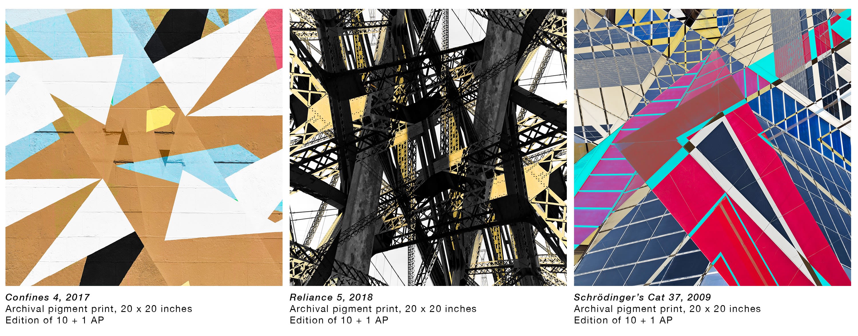 The architecture-based abstractions by Reinfeld in the exhibition Constructed Realities are in three separate bodies of work: Reliance (steel girders), Confines (brick painted surfaces) and Schrödinger’s Cat (the glass sides of buildings). In Confines 4 Reinfeld embraces a pleasing blend of color on brick walls. He highlights the visual of a bridge’s iron structure, and the steel skeleton of buildings under construction that can be seen in Reliance 5. In the Schrödinger’s Cat composites, he takes the refractions and reflections of windows in gyrating abstractions. Yet, our eye is contained within the frame. We don’t fall out of the image but are left with a sense of floating about within the triangular and trapezoidal extractions. Reinfeld comments: “I had the privilege of studying with Harry Callahan, Aaron Siskind, Lisette Model, and Minor White when I went to RISD in 1973 for an MFA in Photography. I was an untrained artist, with no formal education. Essentially, I was a New York City street photographer with the idealism of the 60s. Having a scientific education, I was able to learn the technical aspects of photography, along with the social and political nature of the times. At RISD, everything changed. I was exposed to aestheticism for the first time and how the construction of an image was an essential part of expressing myself through the photographic medium. Harry and Aaron were consummate artists with seemingly different approaches. Taken together, they taught me different ways to approach image making. Harry was a realist and romantic, whereas Aaron saw the world abstractly. As Harry would say to Aaron (paraphrased), ‘When I photograph a wall, it’s a wall. But when you photograph a wall, it’s something else.’ I tended to see more abstractly like Aaron, yet think more philosophically like Lisette. Harry introduced to me that the ordinary things we see are the most extraordinary.”